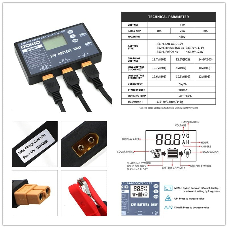Der Controller unterstützt 12-V-Blei-Säure-, Lithium-Ionen- und LiFePO4-Batterien.