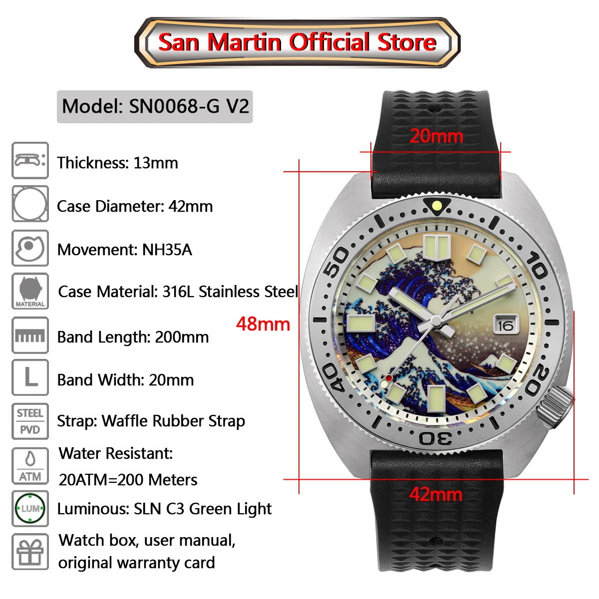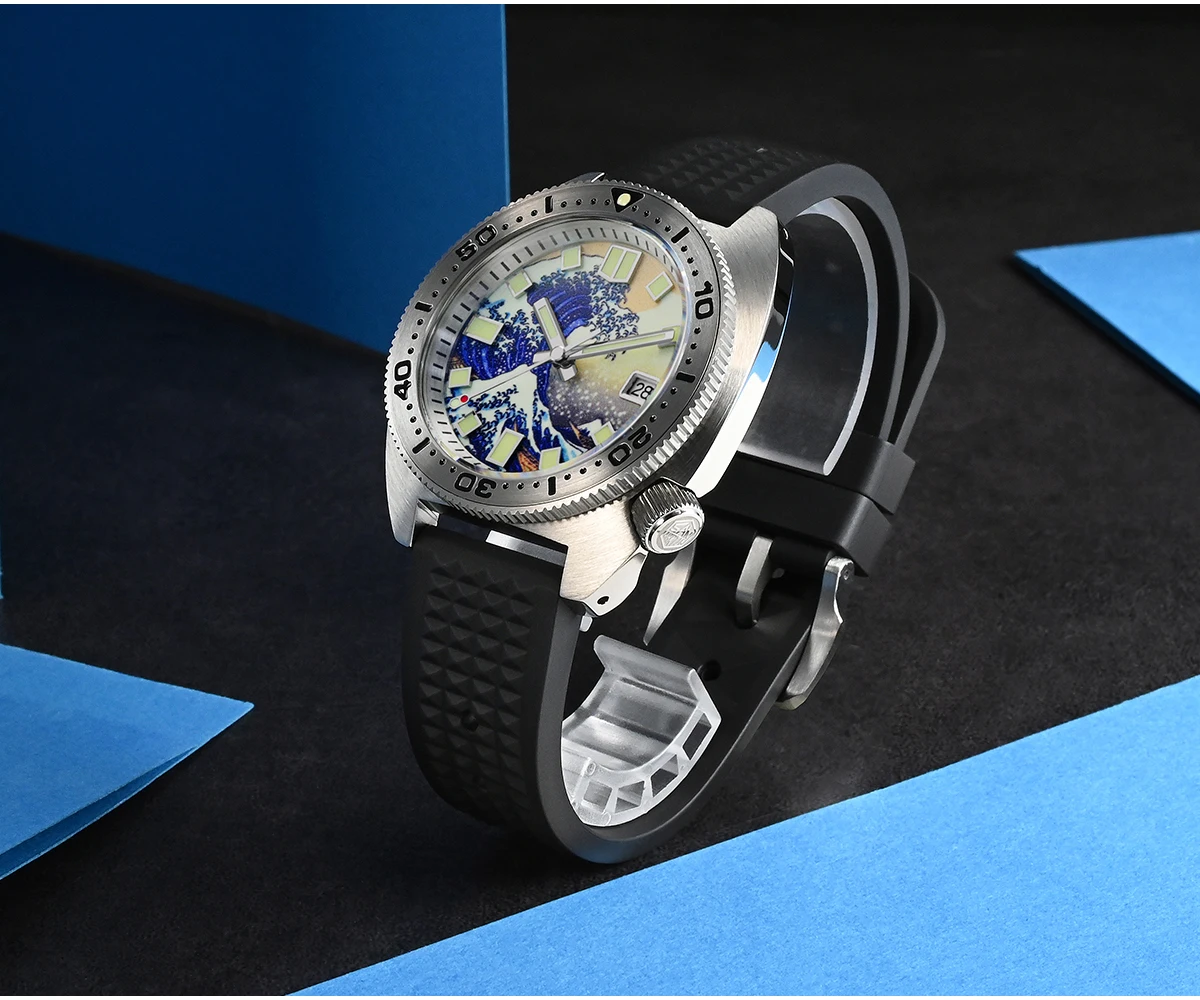 Zifferblattfarbe: MOP-Zifferblatt, 3D-Druck, voll leuchtendes Kanagawa-Surfen, auf 3D-Metall aufgetragene leuchtende Markierungen