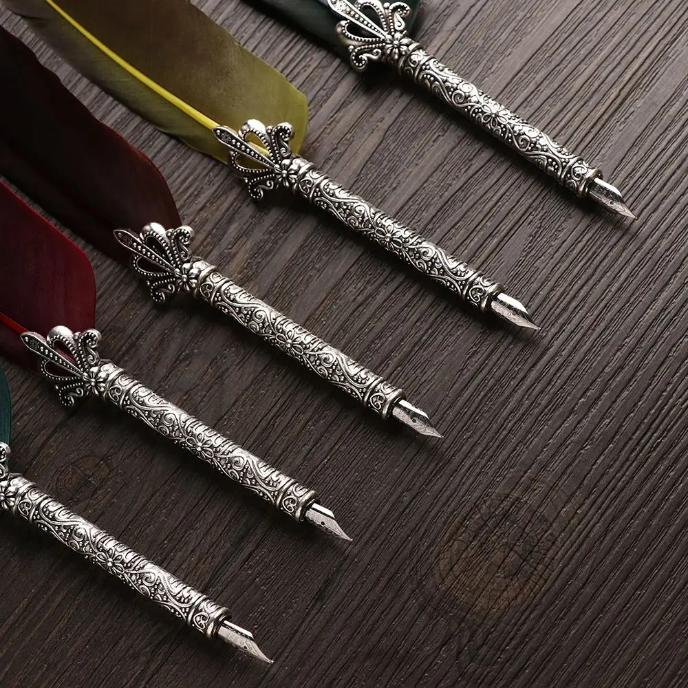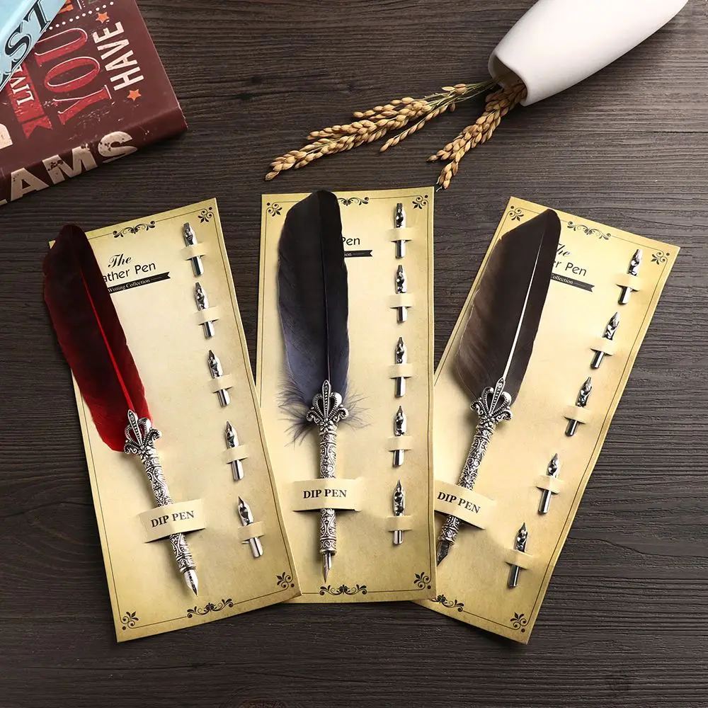 1Set Vintage Feather Pen with 5 Pen-nibs Carved Flower Nib Quill Dip Pen Oblique Pen Set Gift Writing Tools School Office Supply