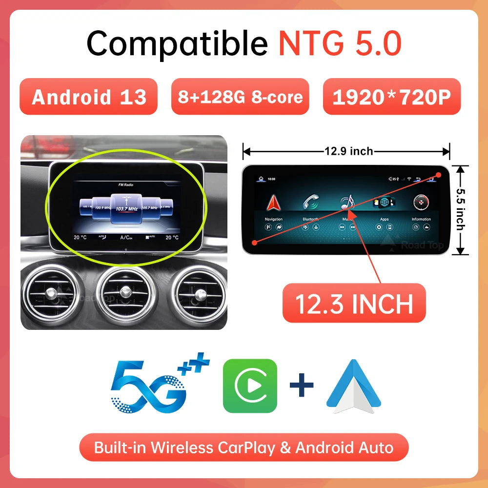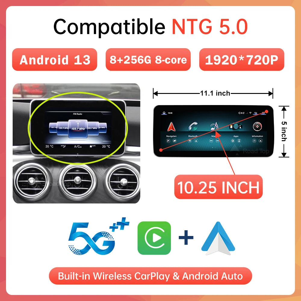 Qualcomm 668 Android 13 Touch Screen Wireless Auto CarPlay For Mercedes-Benz C Class W205 GLC V Class W447 2015-2019 NTG5.0 Car Multimedia Player GPS Navigation Bluetooth 4G WiFi DSP Netflix