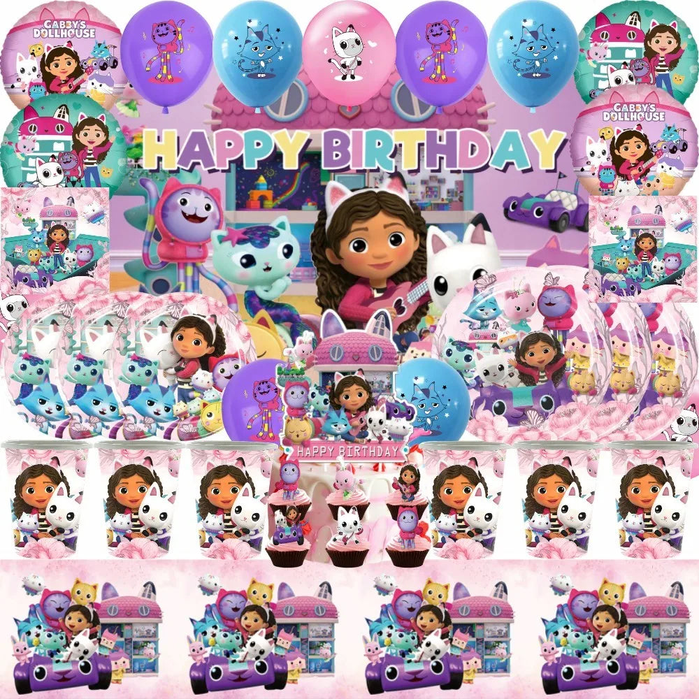 New Gabby Dollhouse Cats Birthday Party Decoration Balloon Pink Cartoon Tableware Backdrop Baby Shower Kids Girls Party Supplies