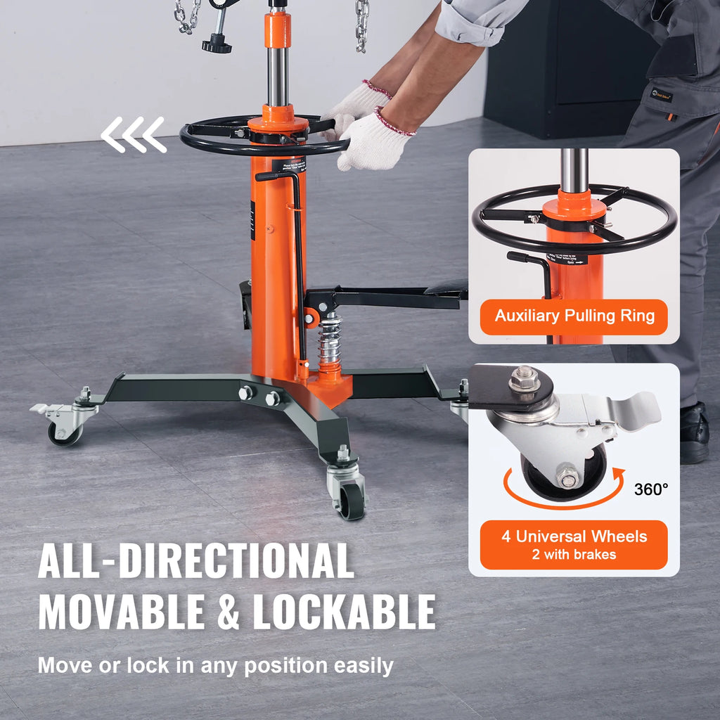 Movable & Lockable: Our transmission jack is equipped with 4 wheels, two of which have brakes, making it easy to move around. The auxiliary ring in the middle enables you to push or pull the jack with ease. Lock the wheels in place to prevent unwanted sliding during use.