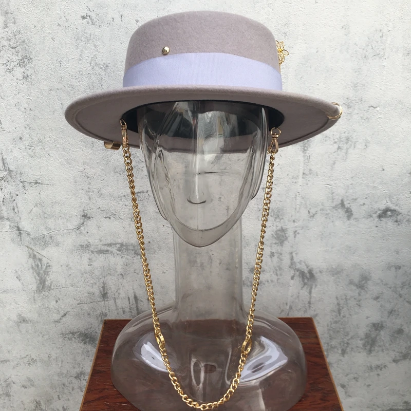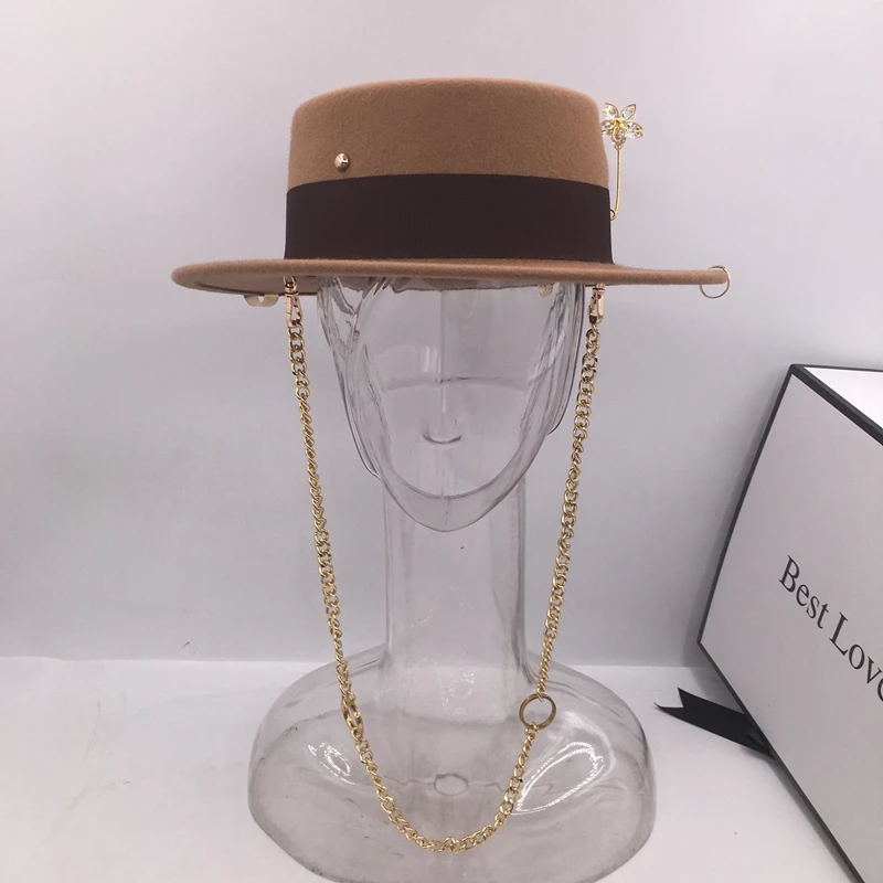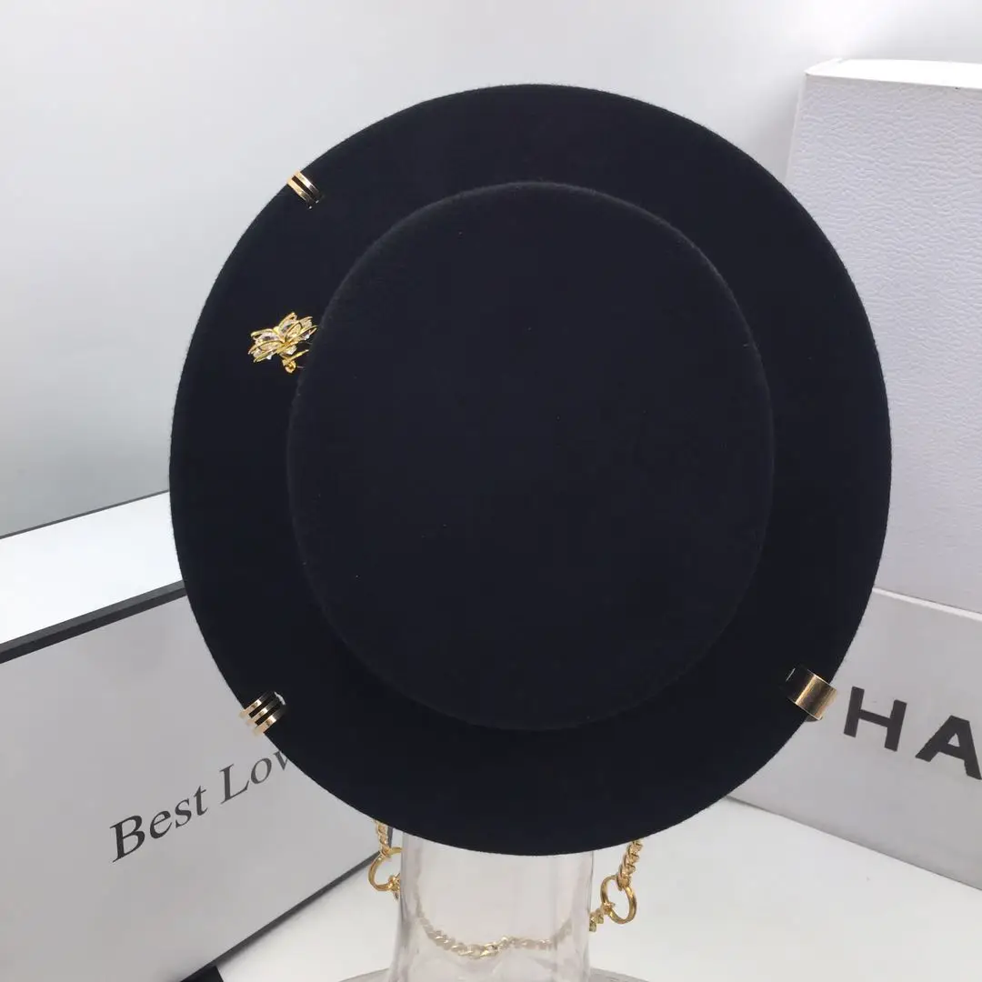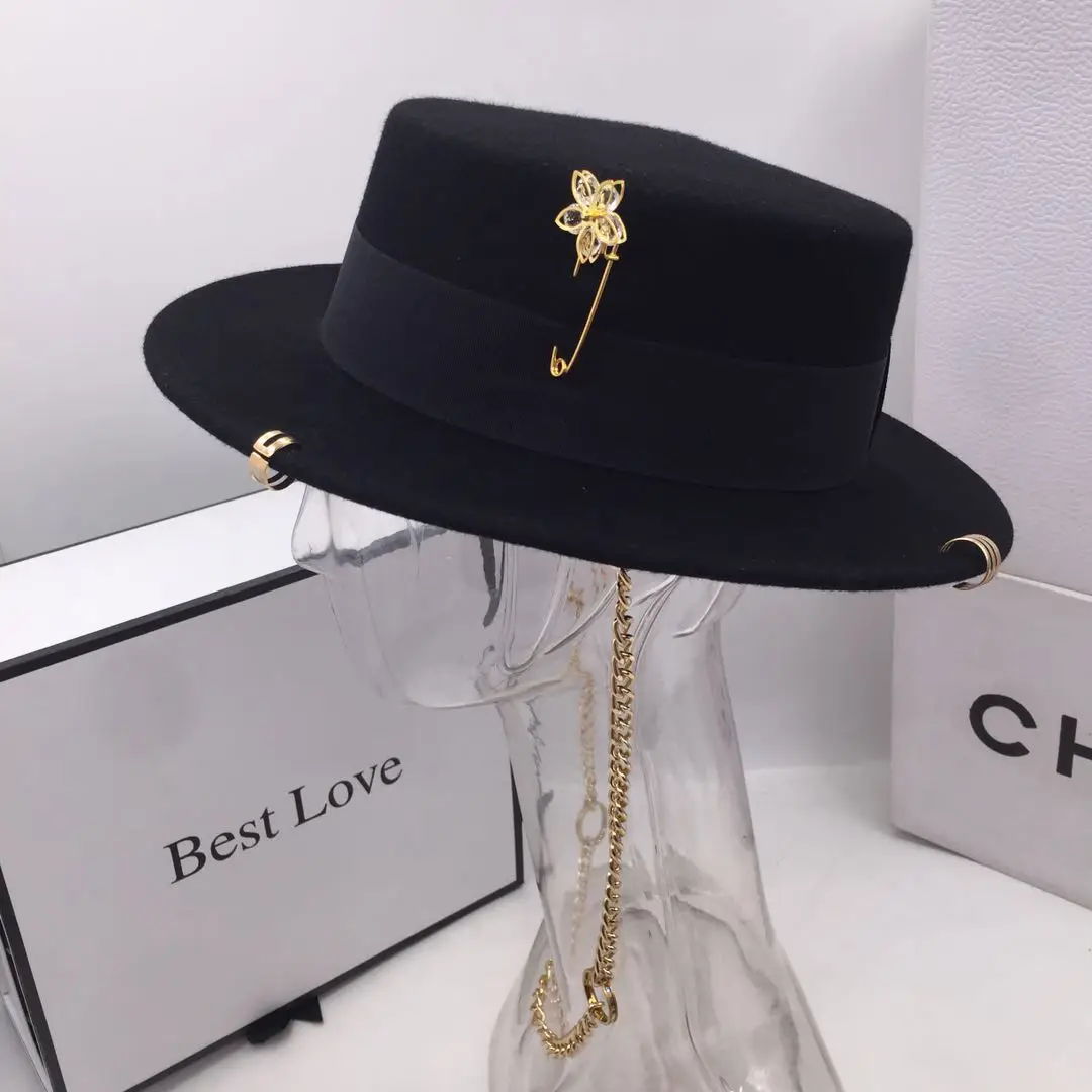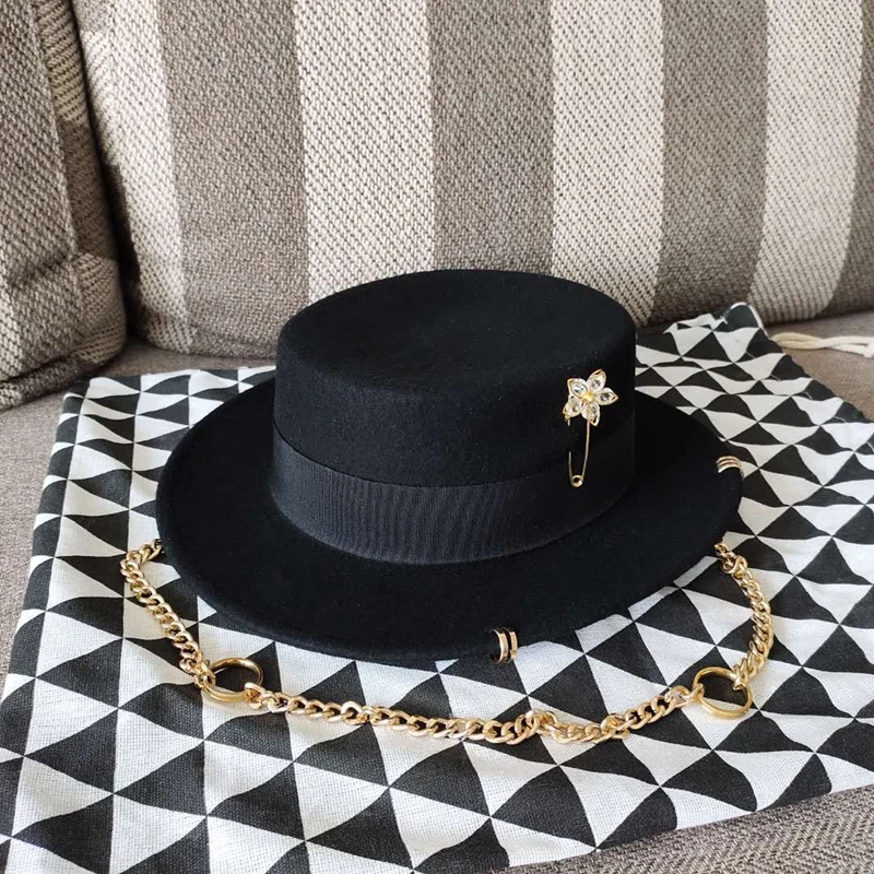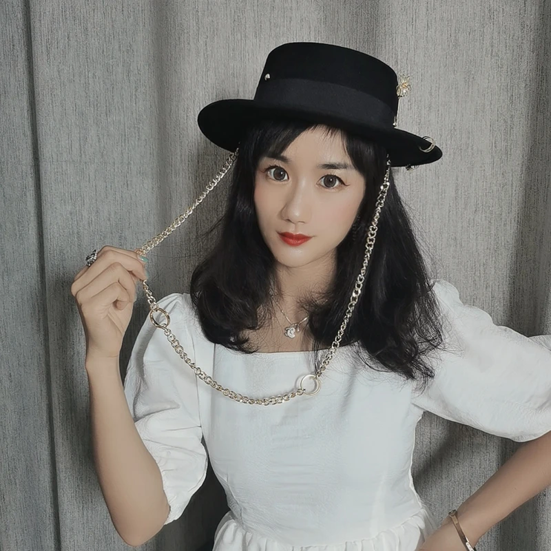 Black cap female British wool hat fashion party flat top hat chain strap and pin fedoras for woman for a street-style shooting
