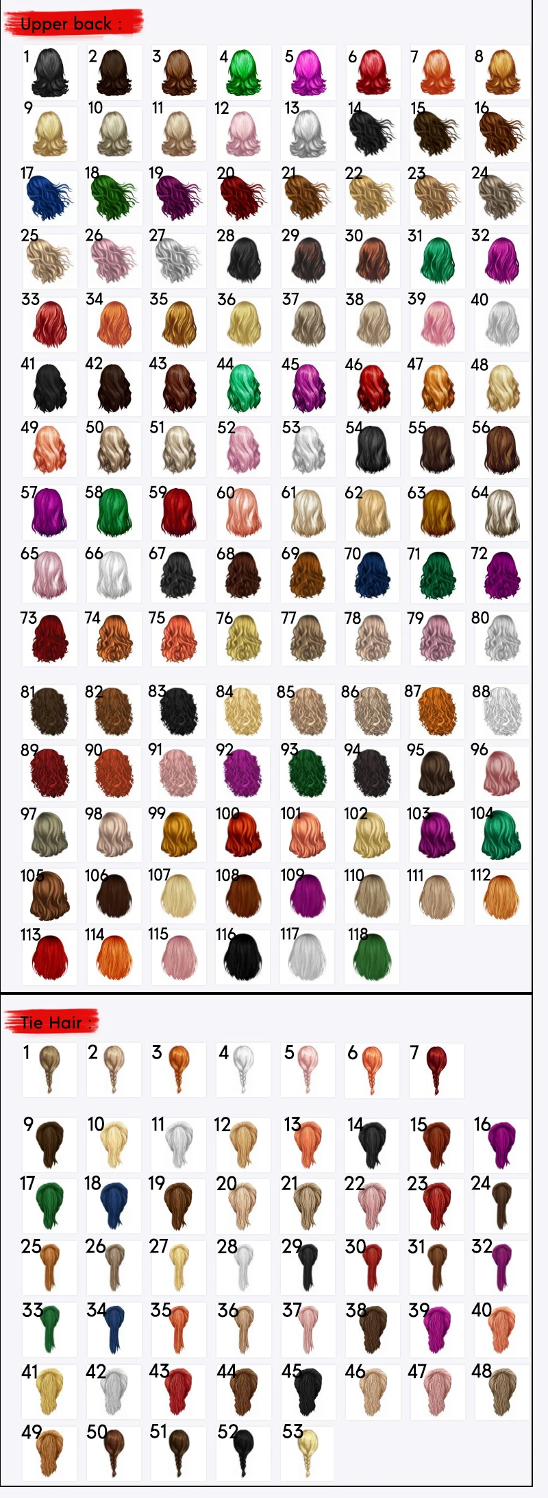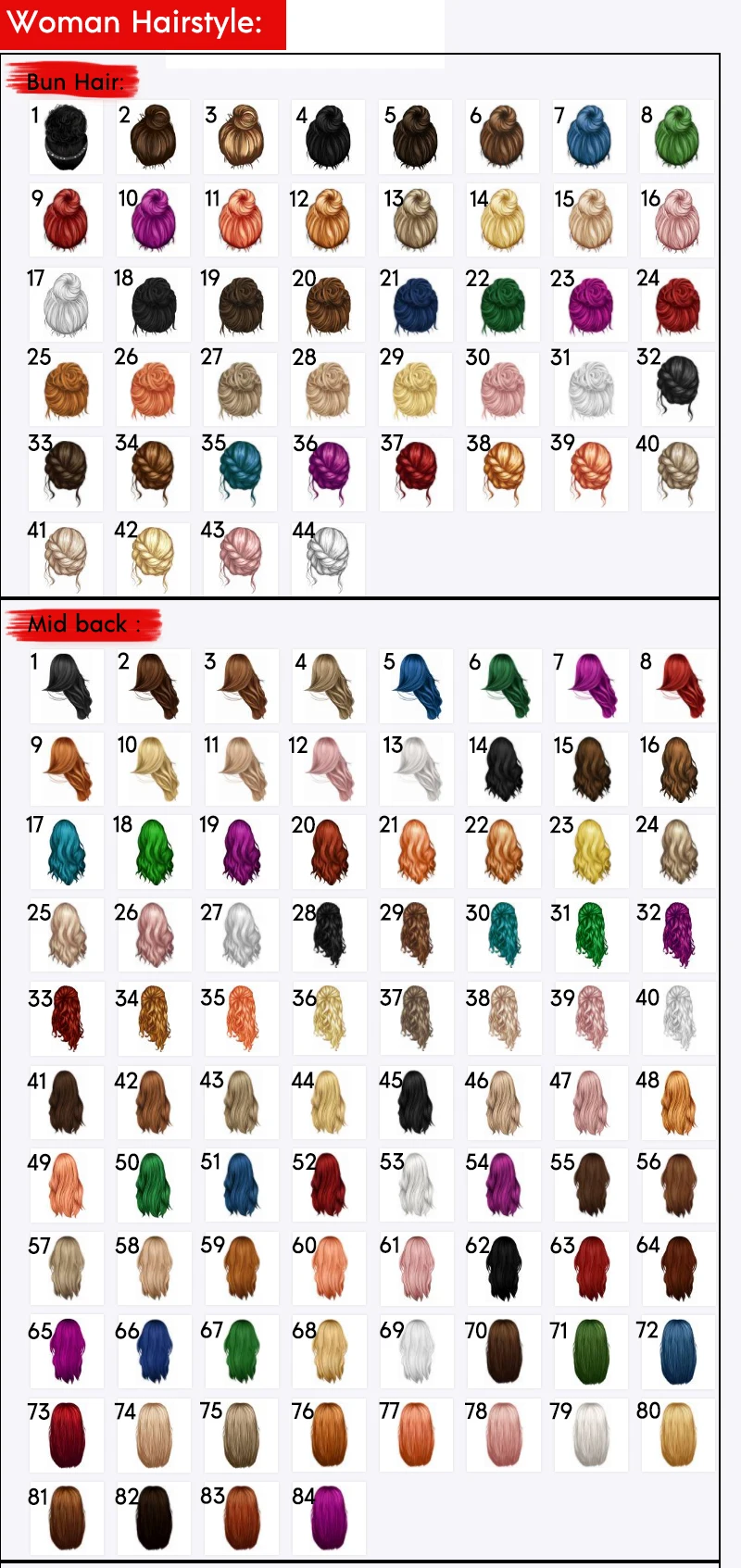 Woman Hair Style: Bun Hair / Mid back / Shoulder length / Neck length / Upper back or Tie Hair