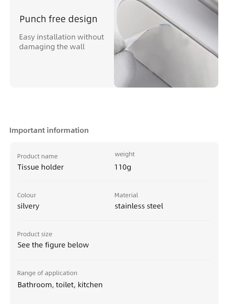 How to use: Remove the protective film of the tape and place the paper towel holder on a smooth surface, (glass, tile, smooth wood, metal surface.) Press for 10 seconds, then leave for 24 hours