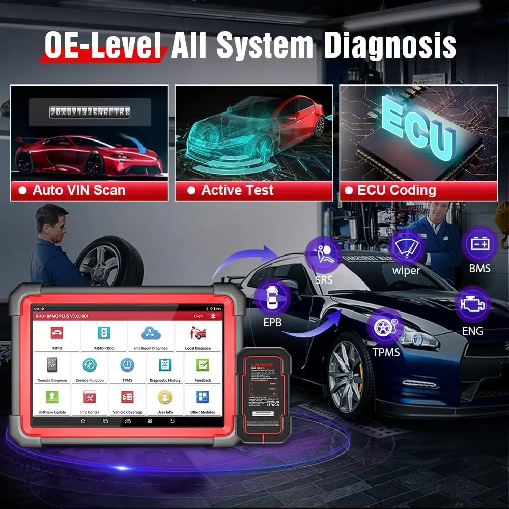 Launch X431 IMMO ELITE Plus access and perform OE-Level diagnosis on all available vehicle modules including but not limited to PCM, ECM, EPS, PDM, BCM, TPM, SCCM and etc and covers all major electronic systems like Engines/Auto Transmission/Airbags/Immobilizer/Key Coding/ABS/Cruise Control/Self Leveling Suspension systems/Seats / Doors / Gateway / Steering Angle / Air Suspension / Body Systems/Electronic Power Steering / Power Steering / Tyre Pressure /Intelligent Parking Assist/Door Motors/Audio systems/Air Conditioning/ Oil Service Reset / Sliding Doors / Electronic Throttle ... and more.