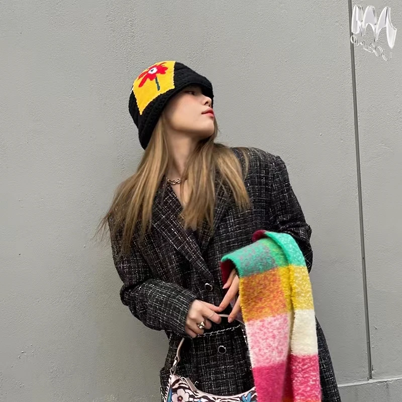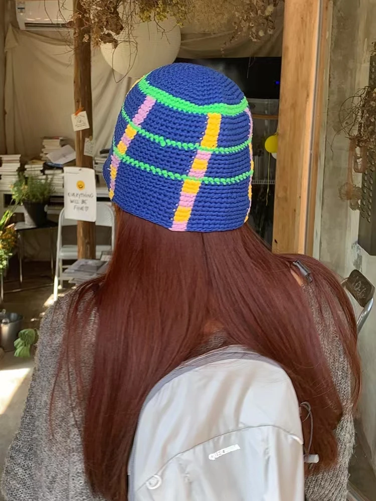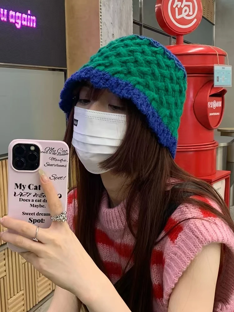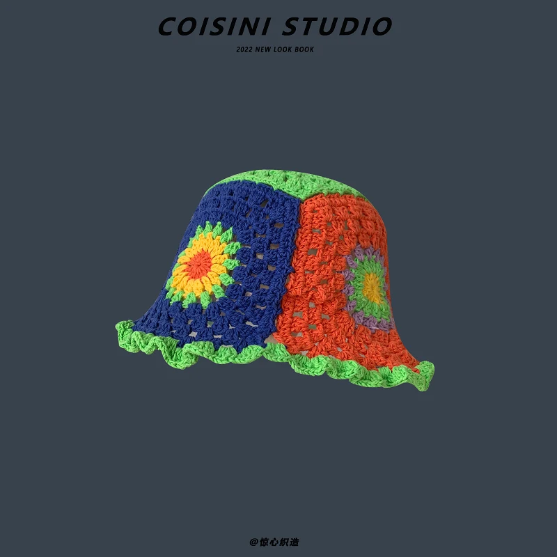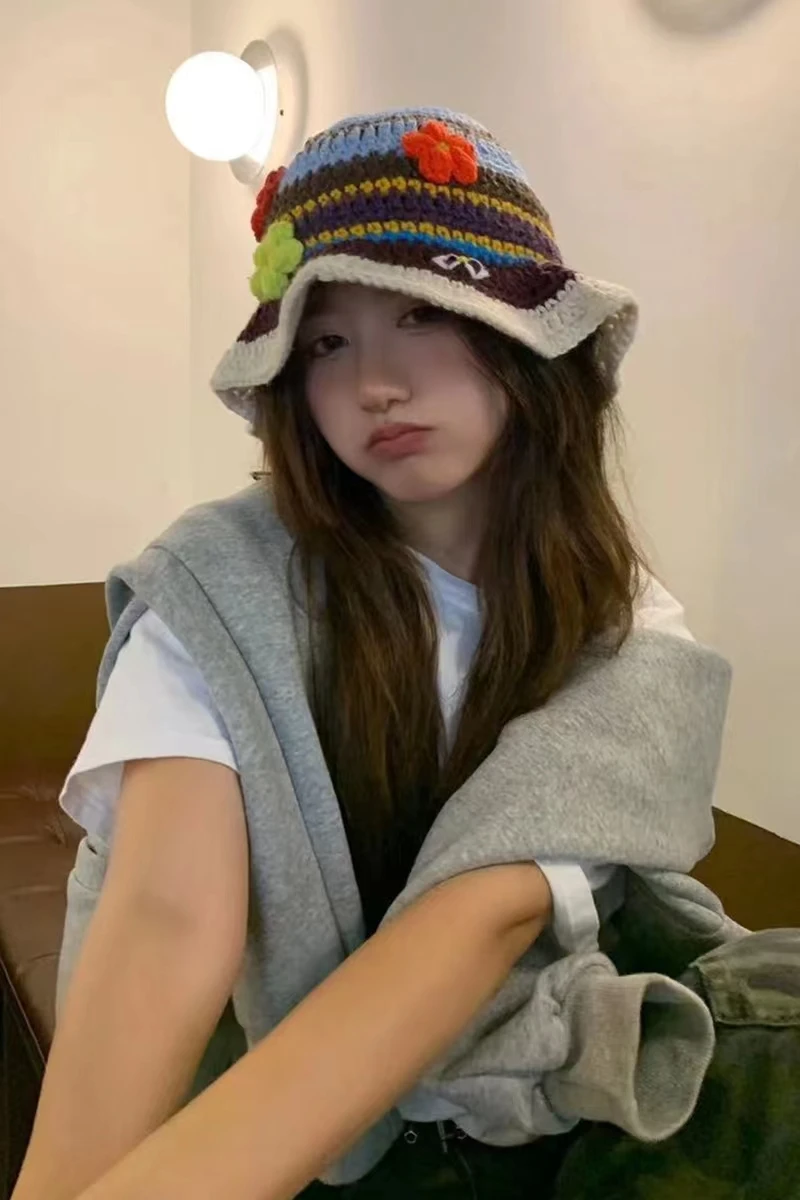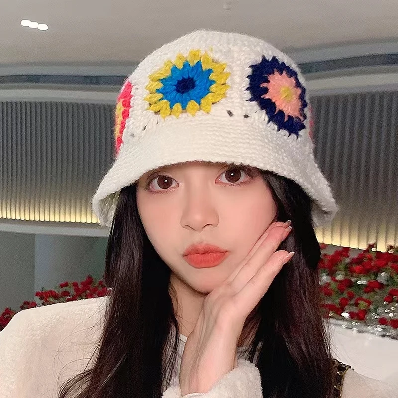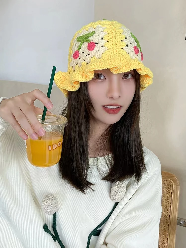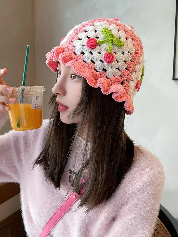 2024 New Korean-Japanese Hand Buckle Crochet Bucket Hat Spring and Autumn Winter Sun Hat Female Cherry Designer Bob Basin Hat