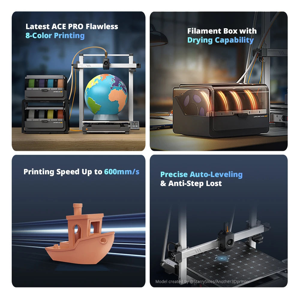 The ACE PRO supports standard 4-color printing;By pairing two ACE PRO units together , you can achieve brilliant 8-color printing, expanding possibilities for more vibrant and colorful creative projects.