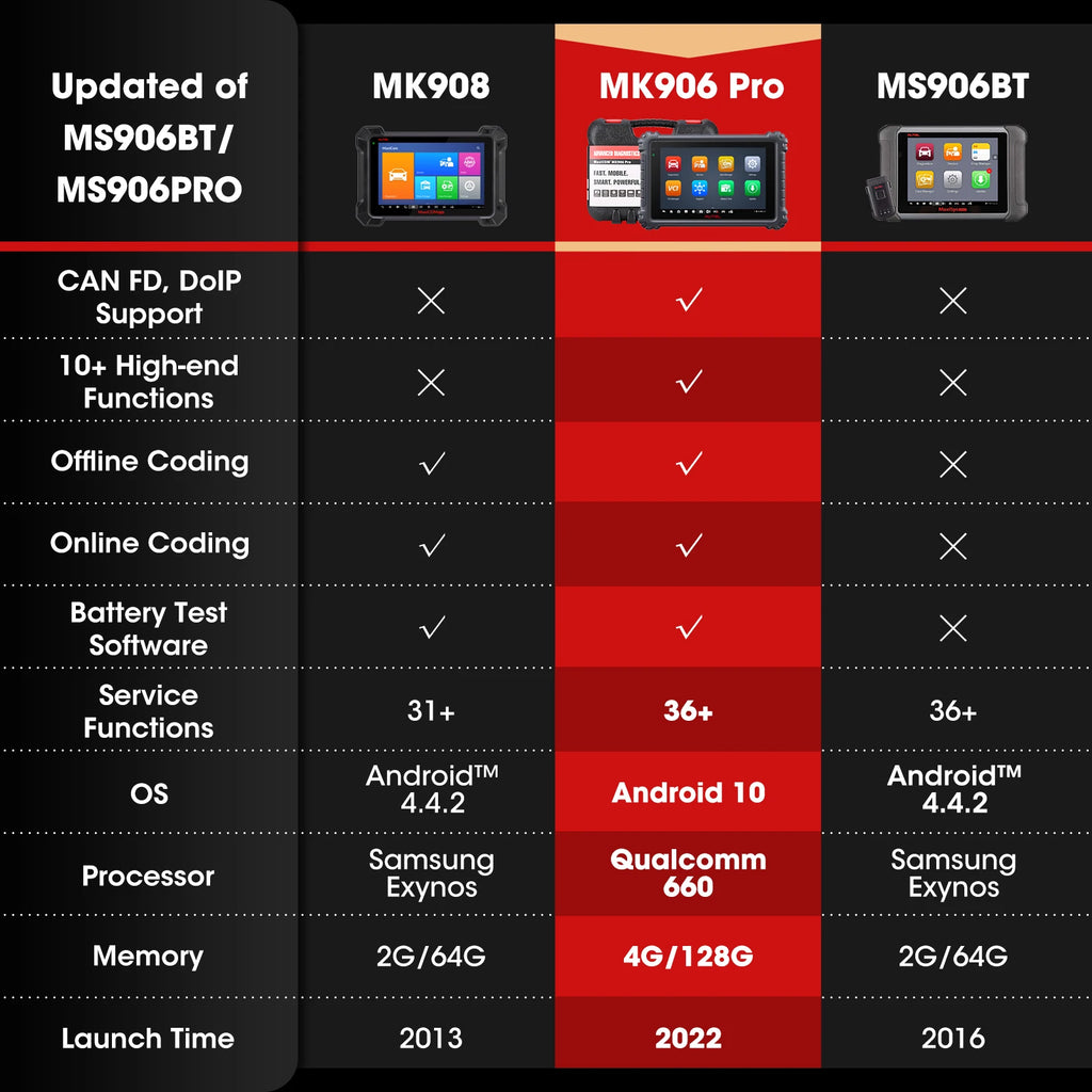 1.Autel MK906 Pro, upgraded model of MS906 Pro / MK906BT / MS906BT, is equipped with 11600mAh Battery, Android 10.0 OS, 16M+16M Camera, and 4+128GB Memory for super-fast & long-lasting continuous diagnostics. New protocols CAN FD & DoIP also make Autel scanner MK906 Pro communicate smoother between vehicle modules.