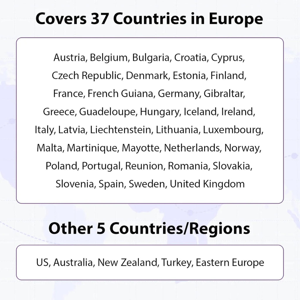 Enjoy reliable connectivity across European countries and beyond, ensuring you're always connected no matter where your travels take you.