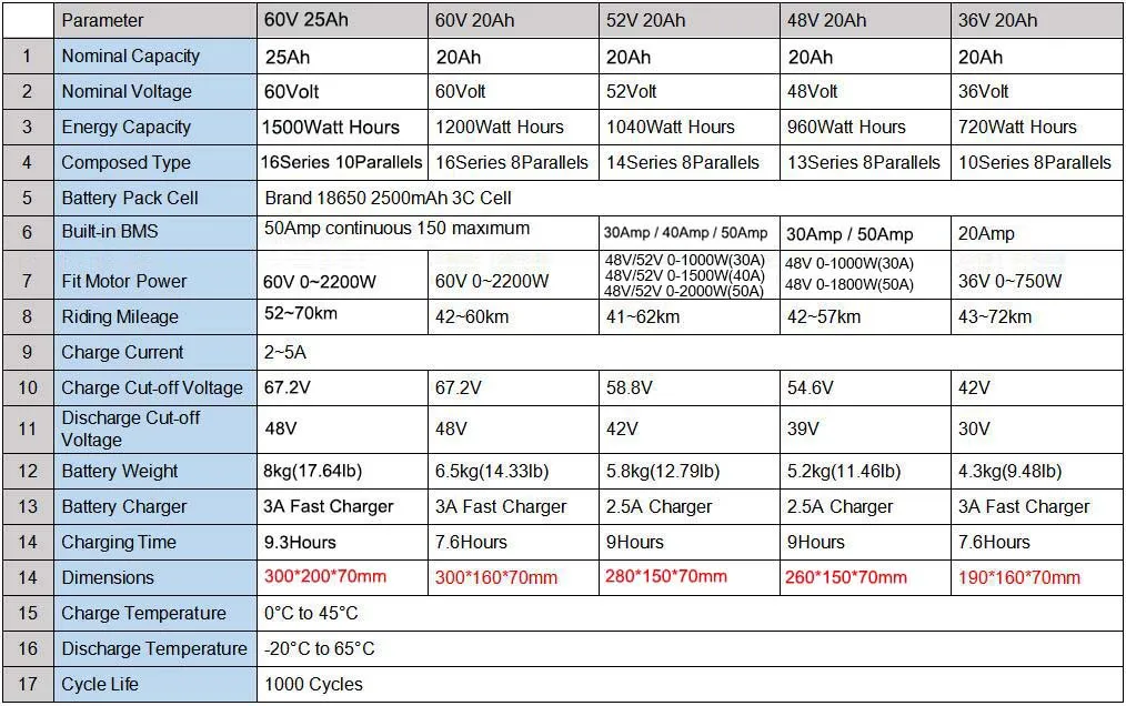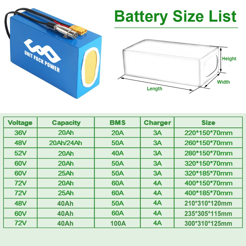 3) 60V 40Ah built-in 60A BMS, fit for 1000W 1500W 2000W 2500W motor;