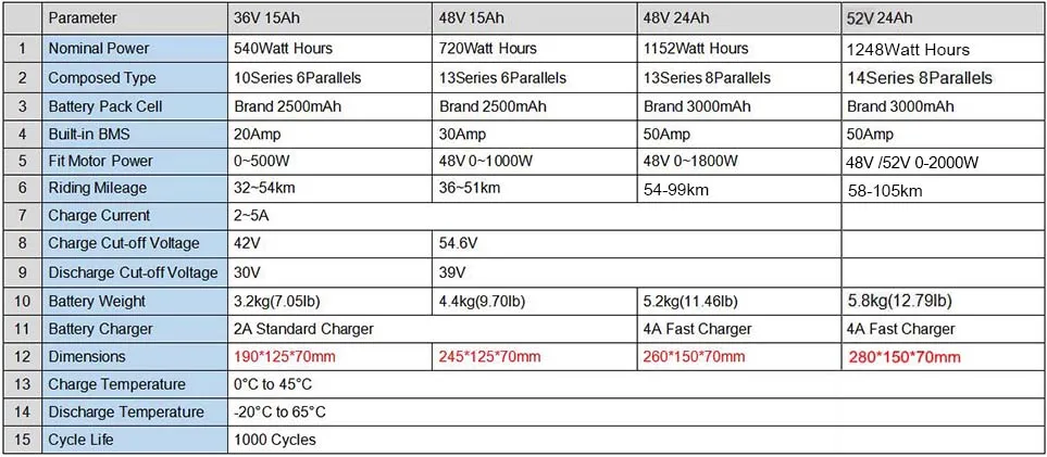 1) 48V 40Ah & 50Ah built-in 60A BMS, fit for 500W 750W 1000W 1500W 2000W motor;