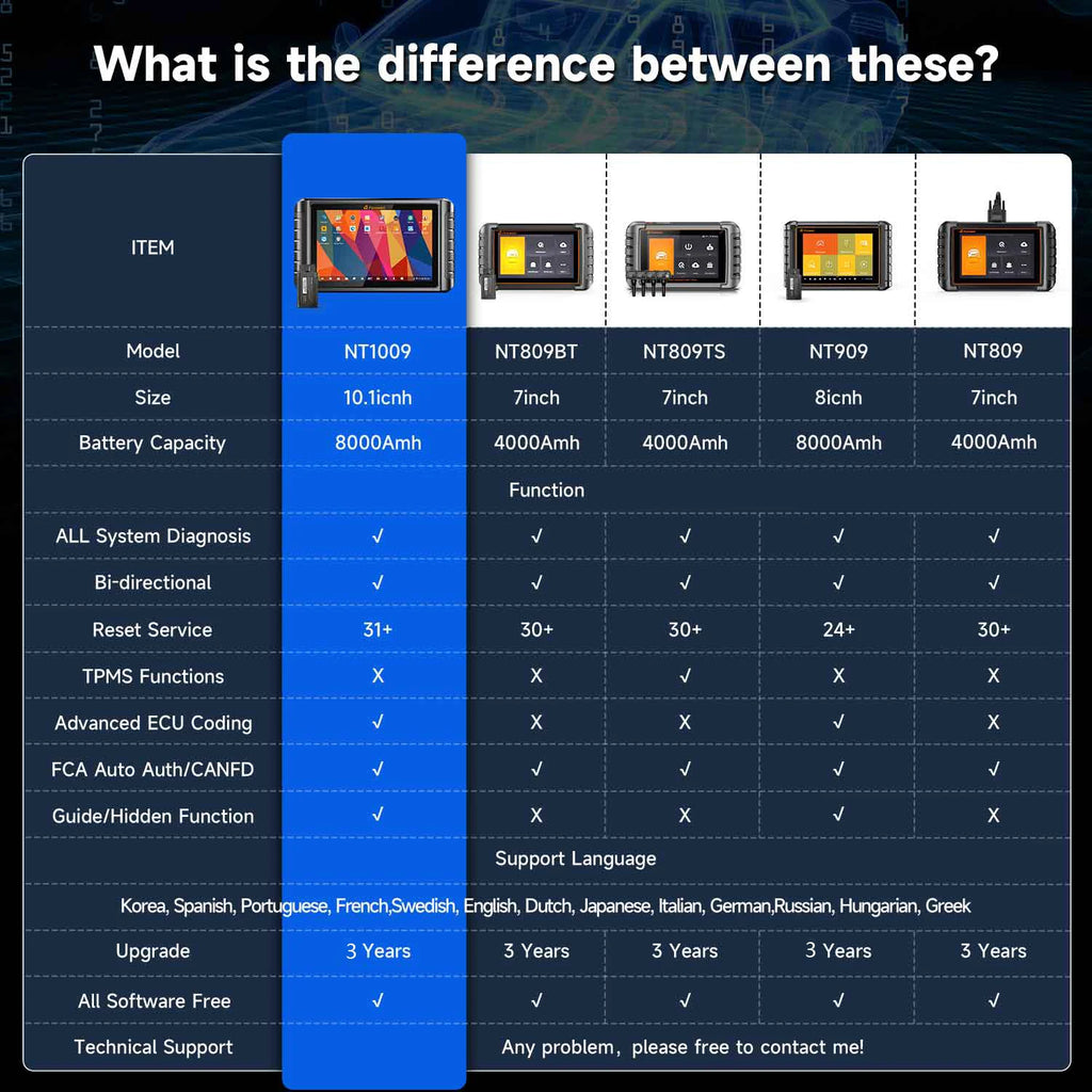 2. NT1009 added ADBLUE, FRM RESET, CHANGE TIRE SIZE, ACLEARN, NOXSENSOR RESET.