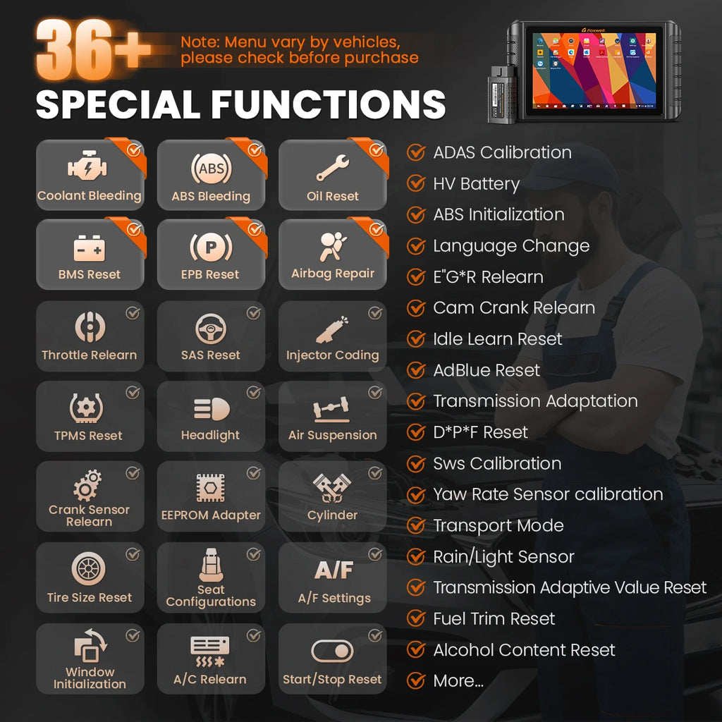 ●36+Hot Reset Services. commonly-used service functions like a/f adjust, Oil Reset, ABS Bleeding, Throttle Relearn, Injector Coding, TPMS Reset, BMS, Power Balance, etc.