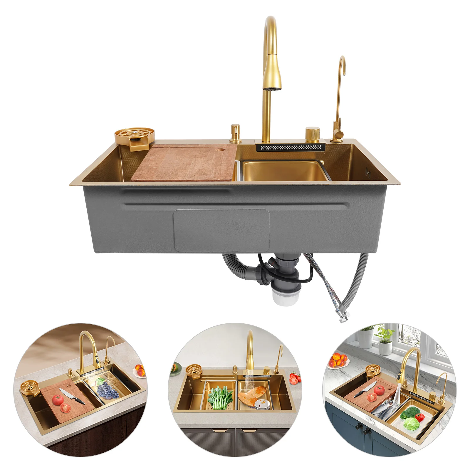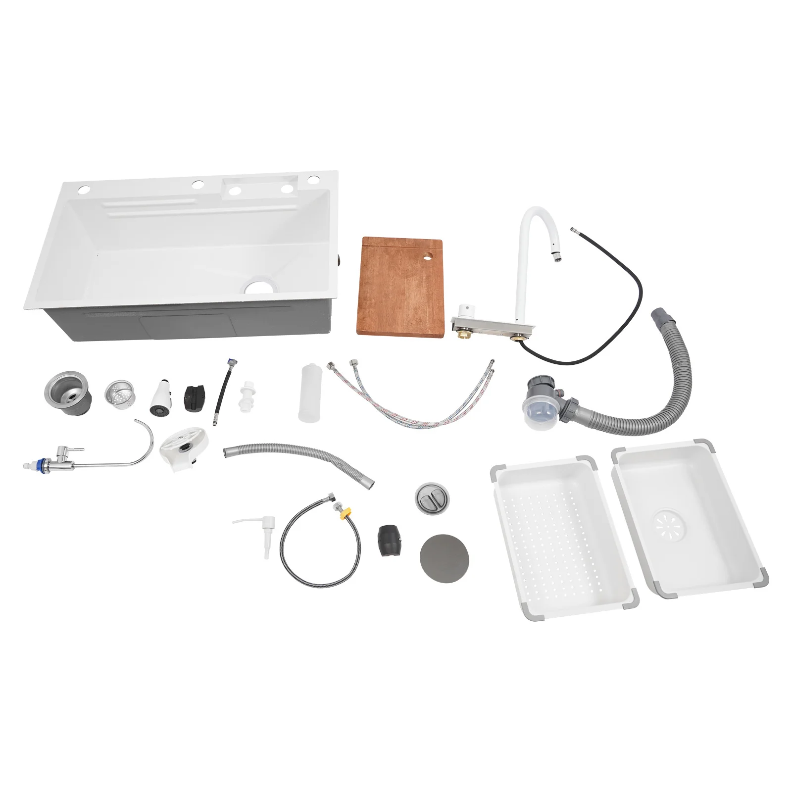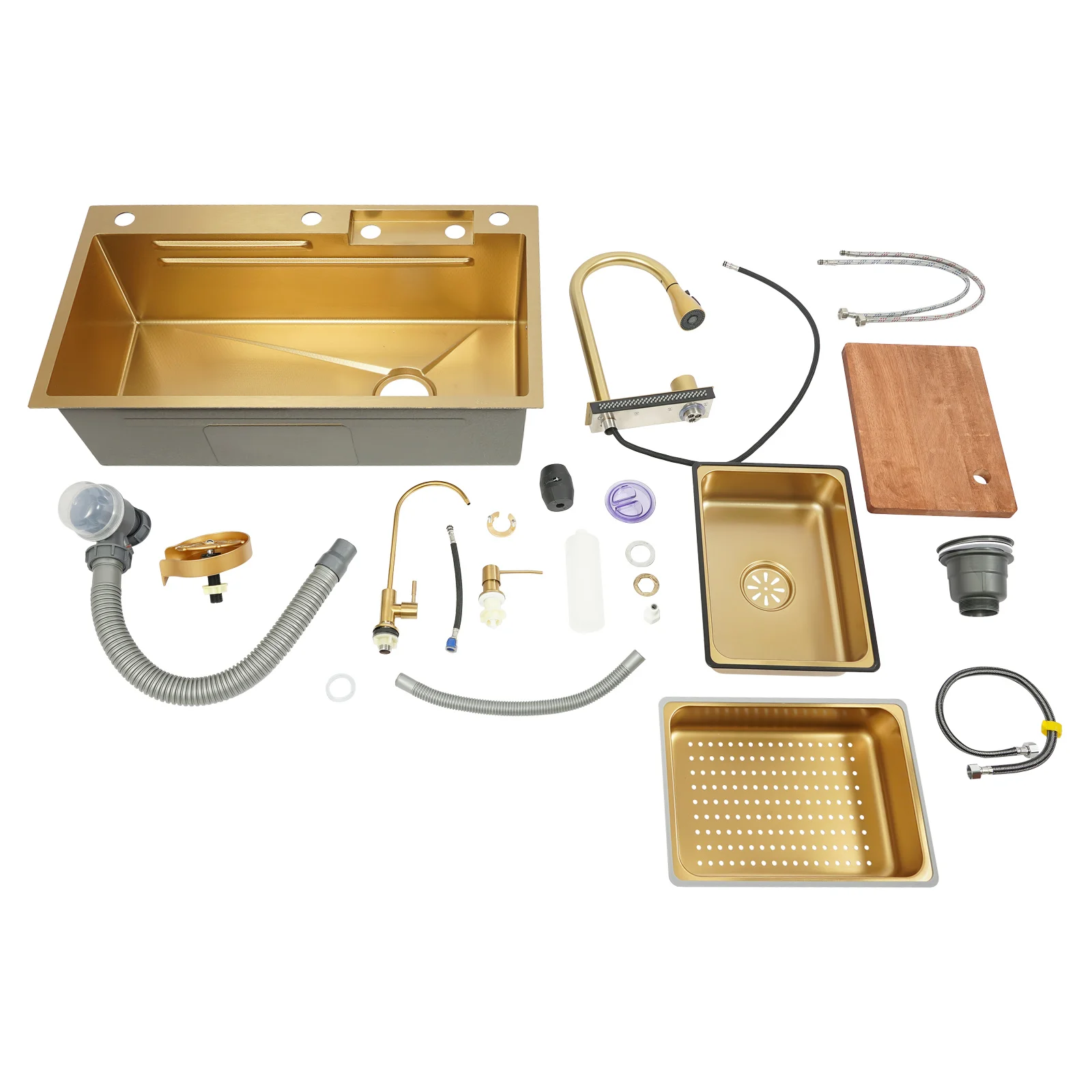 Efficient Kitchen: The product has a total accessories of the faucet, drainage kit, movable basin, drain basket, chopping board, cup washer, soap dispenser, water purification faucet etc., the complete supporting equipment means you do not need to buy other accessories frequently, saving time and effort and making your kitchen work more efficiently.