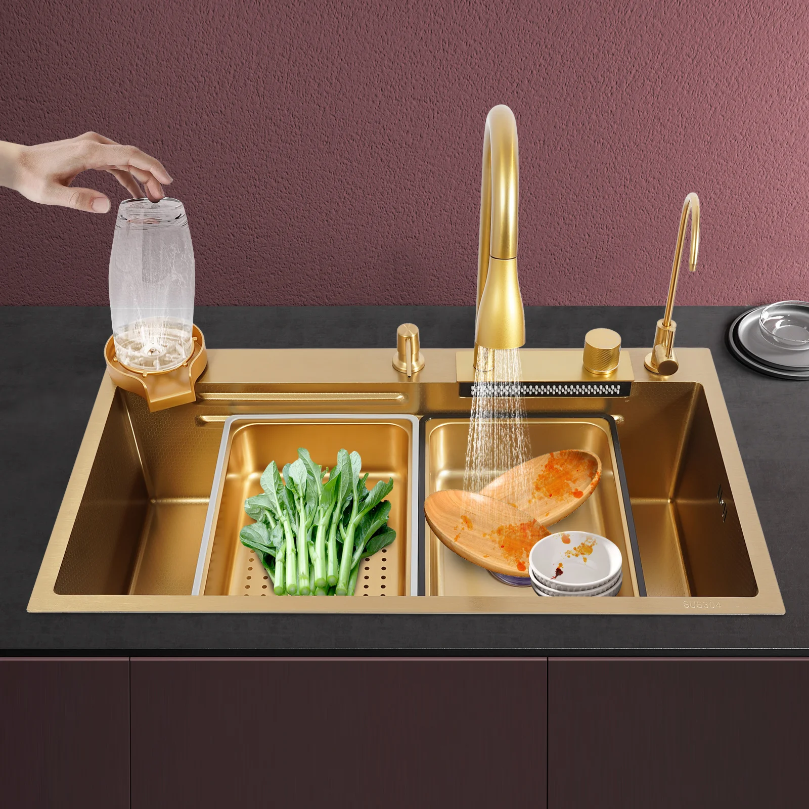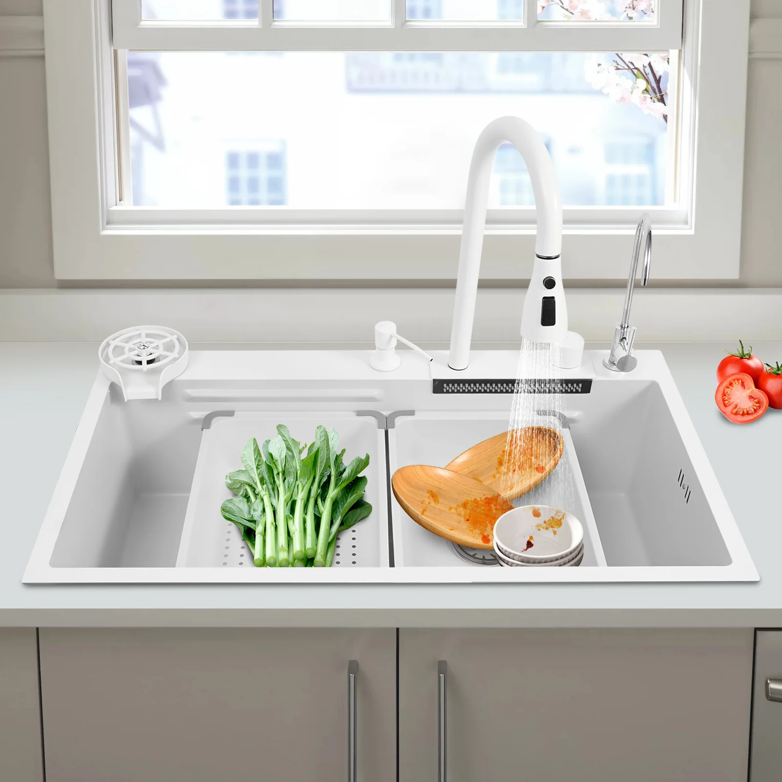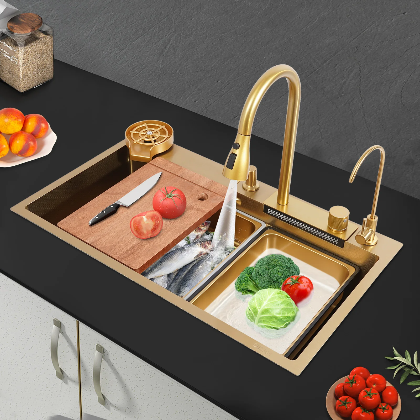 Efficient Kitchen: The product has a total accessories of the faucet, drainage kit, movable basin, drain basket, chopping board, cup washer, soap dispenser, water purification faucet etc., the complete supporting equipment means you do not need to buy other accessories frequently, saving time and effort and making your kitchen work more efficiently.