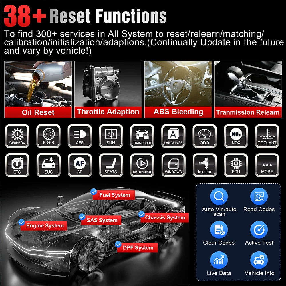 20.Nox Sensor Reset-Resetting the catalytic converter learned value stored in the ECU is important for maintaining vehicle performance. 21. Seat Calibration 22. De lete Transport Mode 24. Windows Calibration 25. AC System Relearn/Initialization 26. E.GR Reset 27. Reset Fuel Trim 28. High Voltage Battery Diagnostics 29. GPF Regeneration 30. Camshaft/Crankshaft Sensor Relearn 31. Interactive Vehicle Dynamics (IVD) Initialization Sequence 32. Fuel Economy Test 33. Halt/Resume Transmission Adaptive Learning 35. Relearn Vehicle Data36. Initialisation Of Automatic Tailgate 37. Initialise Power Window Regulators 38. Seat Standardisation 39. Normalise Slide/ Tilt Sunroof 40. Zero-Point Calibration 41.BSI Solenoid Test 42. Clutch System Learn 43. VGT Relearn 44. Transmission Service Fast Relearn 45. SWS Initialization 46. VIN Registration(Write) 47. Fuel Injector Balance.