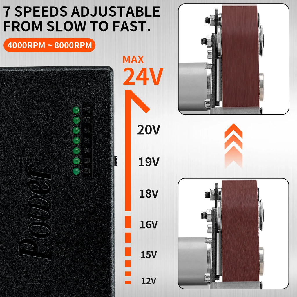 The angle of the worktable of the power belt sander can be adjusted at will, which is convenient to use. Belt knife sharpener has super powerful motor, no-load speed: 4500-9000RPM can grind metal, knife making, wood, acrylic and other materials well. Grinding high hardness materials, efficient and stable, strong and practical.
