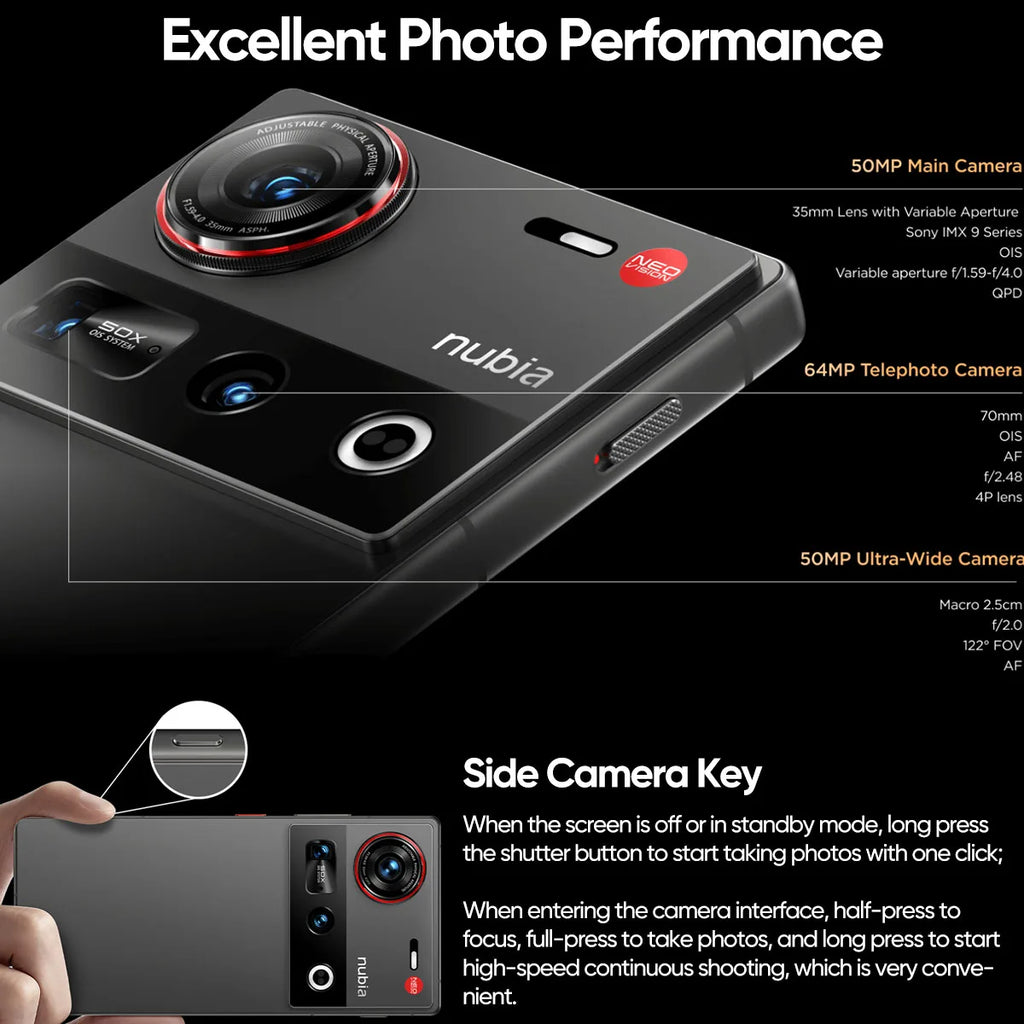 The nubia z70 ultra is the world's first smartphone camera equipped with a 35mm with adjustable physical aperture. stunning craft, lifelike images in any setting.Adjust the aperture to snag the perfect shot every time, whether it's a breathtaking landscape or a candid moment.