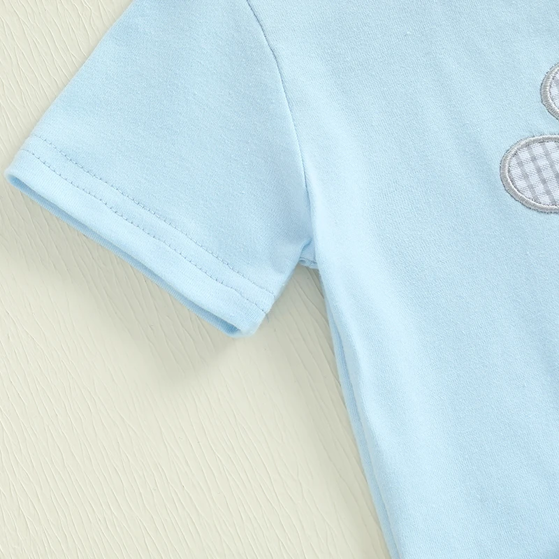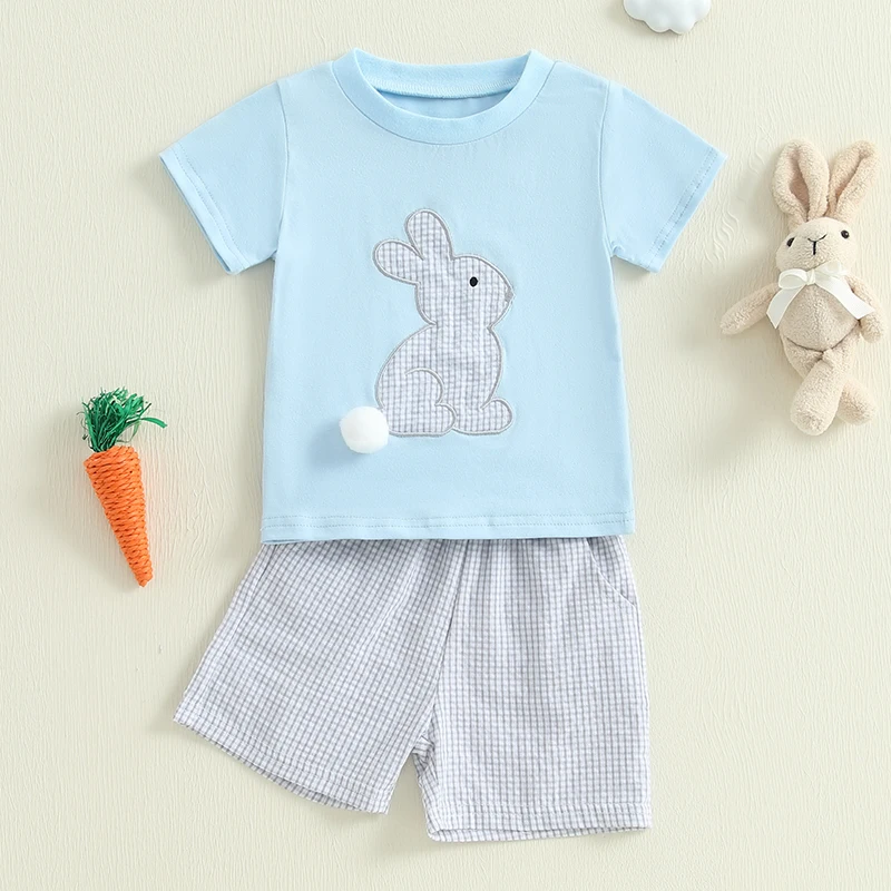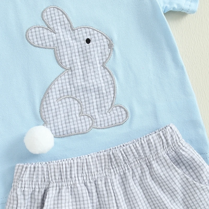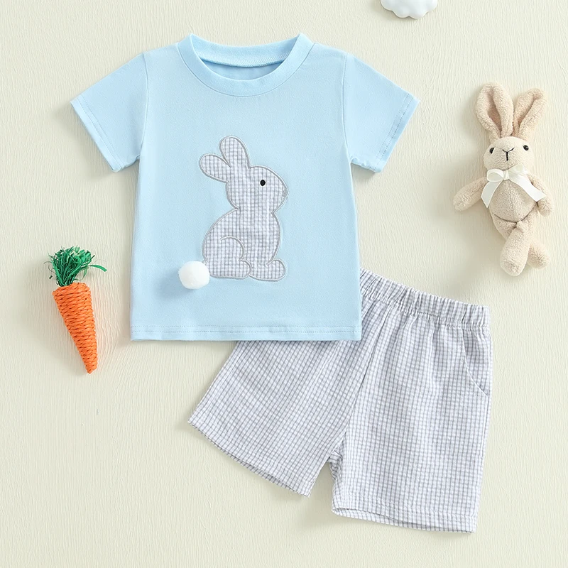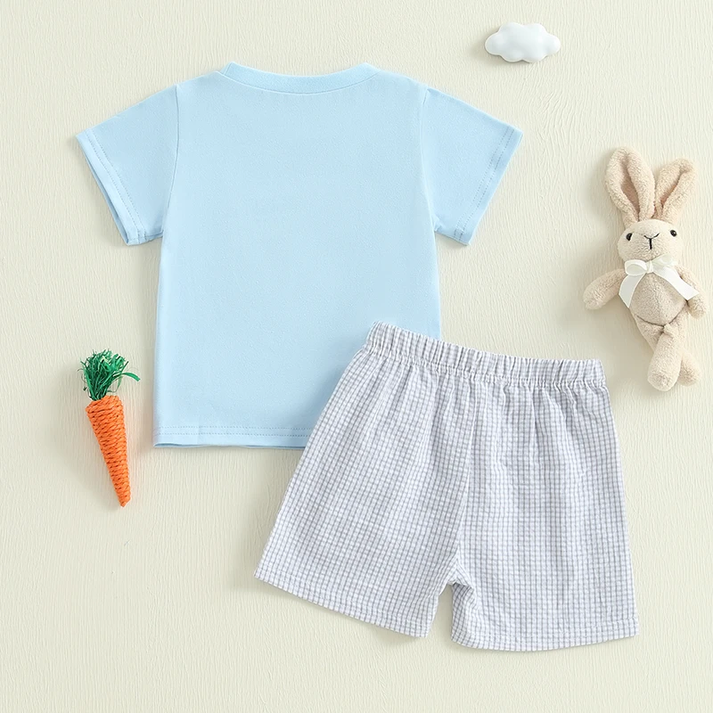 Baby Toddler Boy Easter Outfit Rabbit Embroidery Short Sleeve T-shirt Plaid Shorts 2 Piece Set for Spring Summer