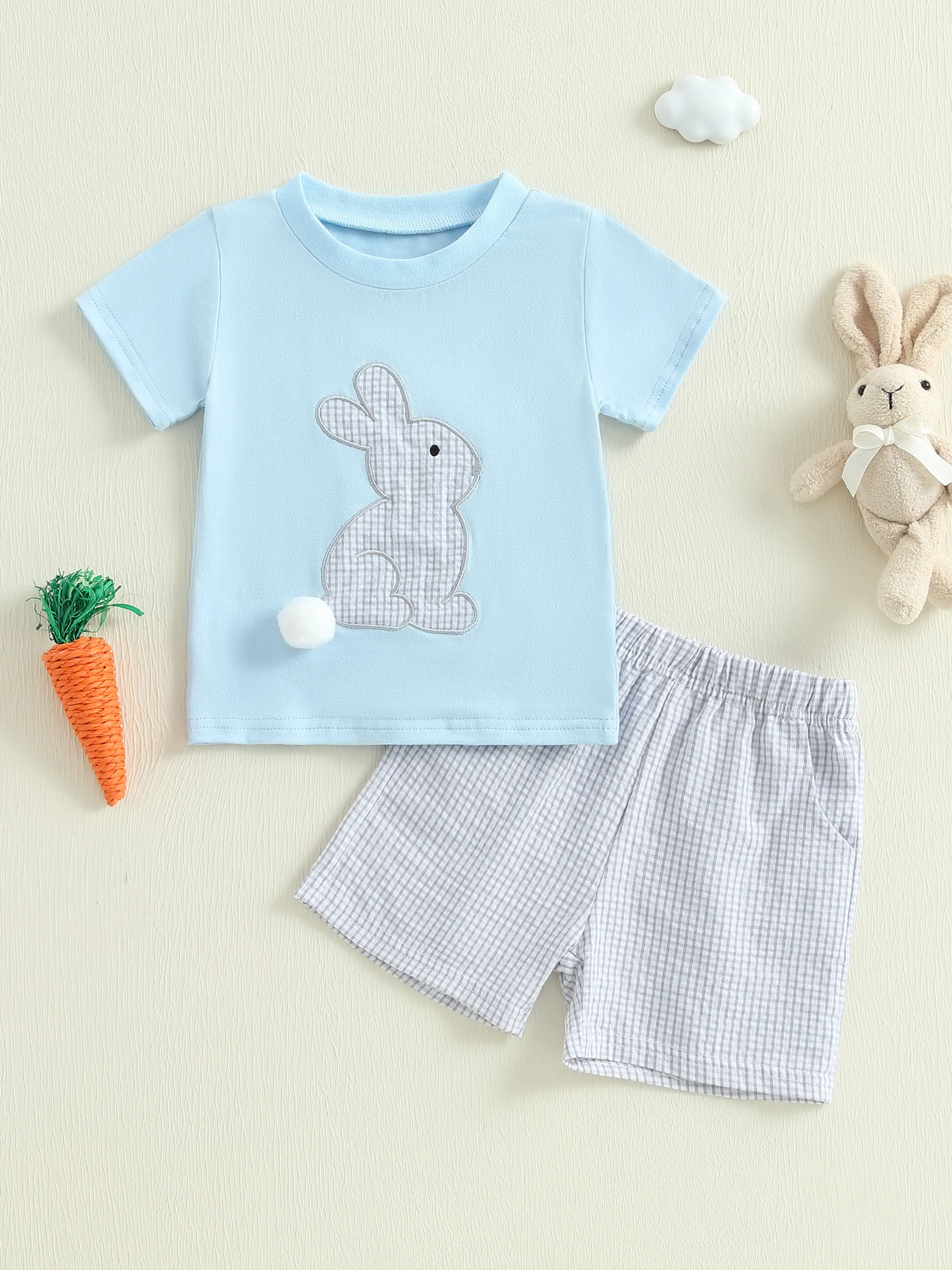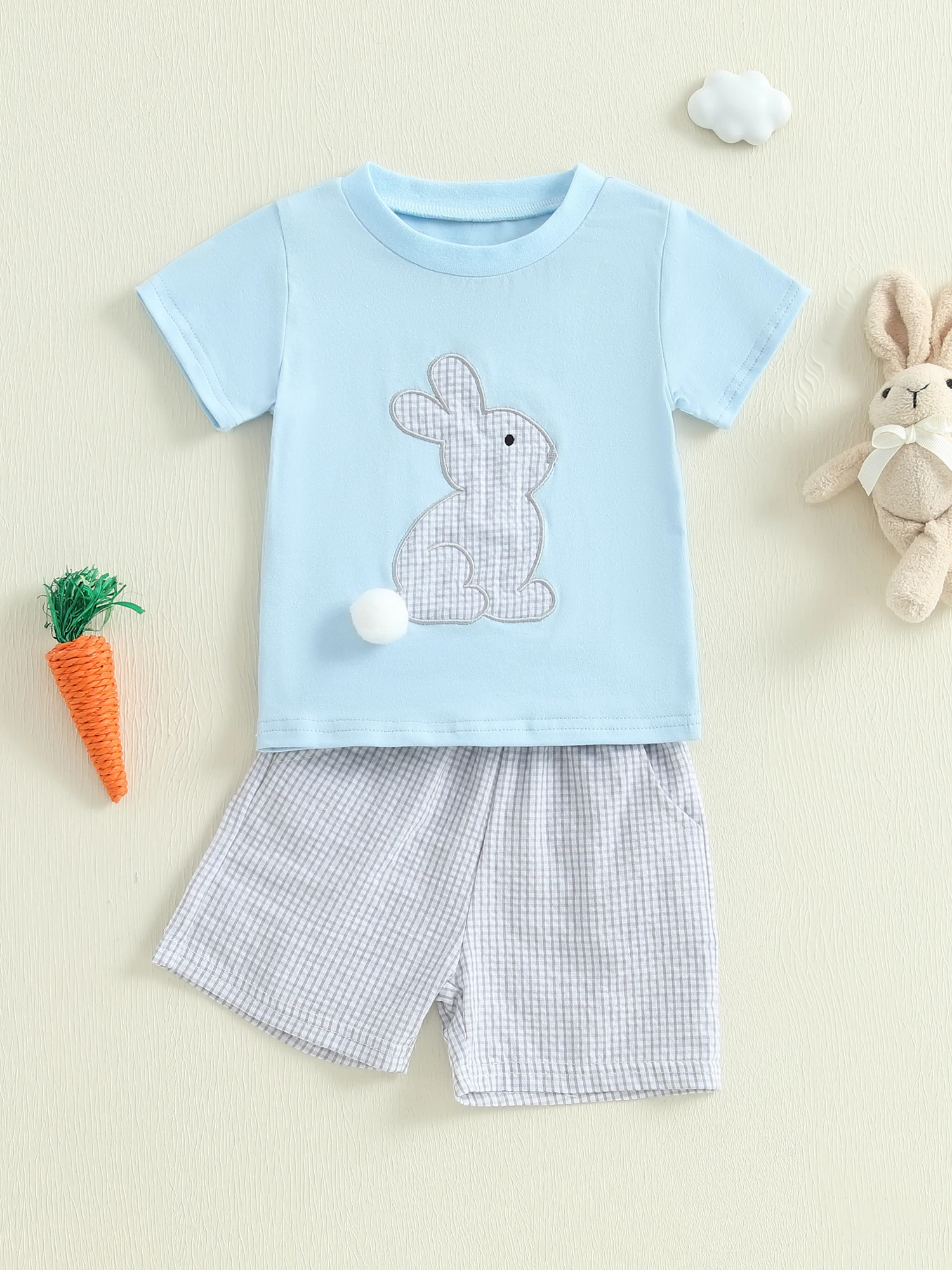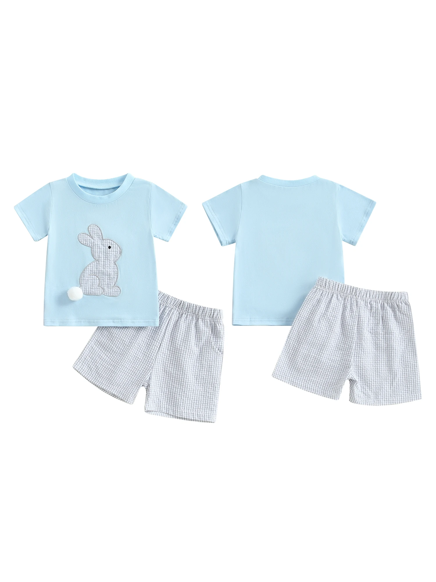 Baby Toddler Boy Easter Outfit Rabbit Embroidery Short Sleeve T-shirt Plaid Shorts 2 Piece Set for Spring Summer