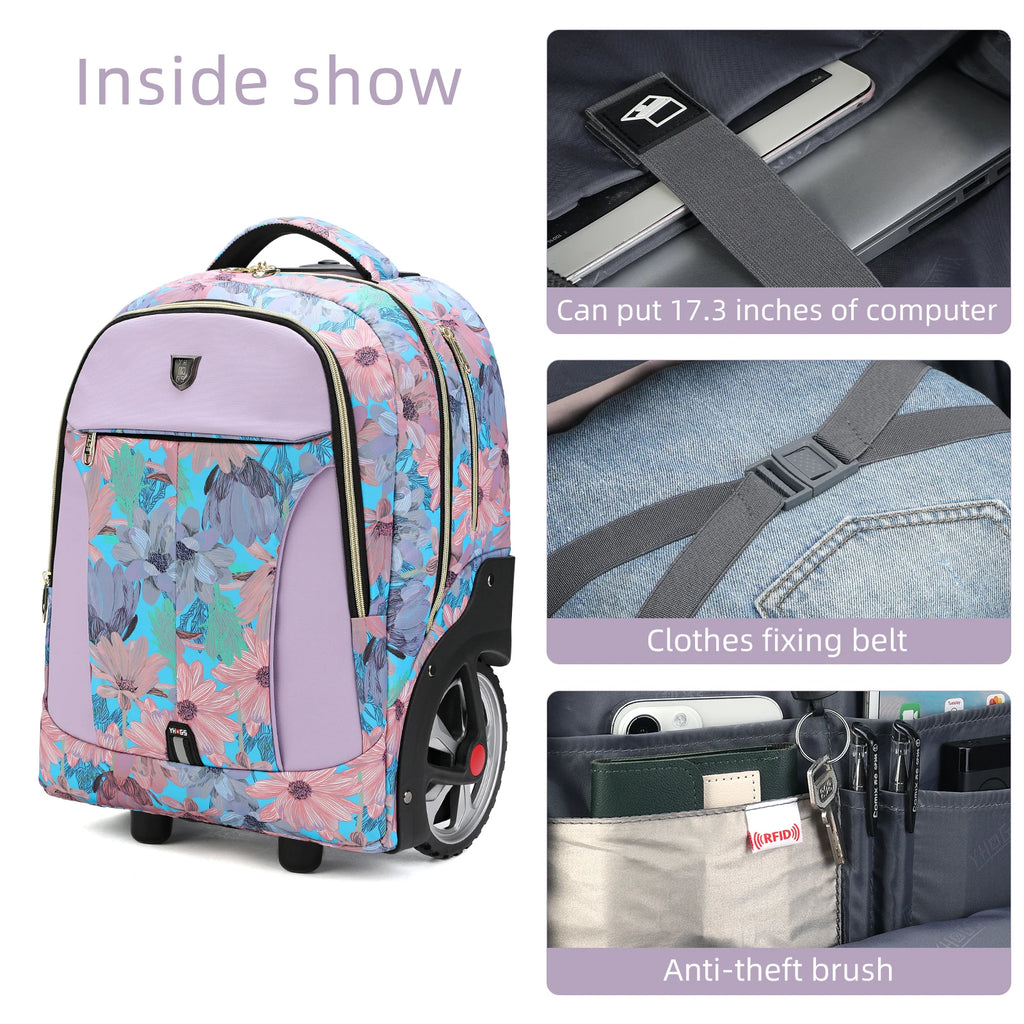 【Large Capacity Rolling Backpack】 Wheeled backpack size:37*26.5*53CM 20 inches,this rolling backpack built in laptop padded compartment,can hold 17.3 inch laptop and satisfy your daily outdoor needs