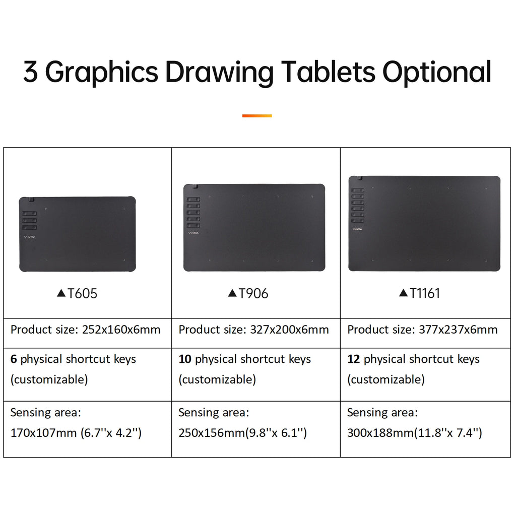 VINSA T1161 Graphics Drawing Tablet Ultra-thin Art Creation Sketch with Battery-free Stylus 8 Pen Nibs 8192 Levels Pressure