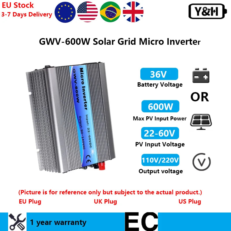 Y&H 600W Grid Solar Inverter MPPT Pure Sine Wave Micro Inversor 24V 36V BAT 11-32V PV Input AC120V/220V Solar Panel Home System