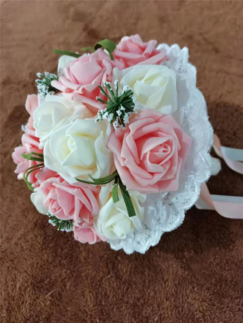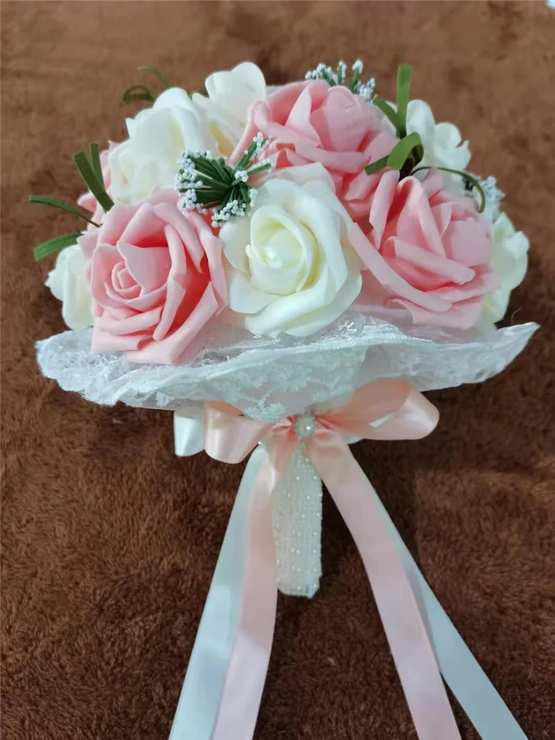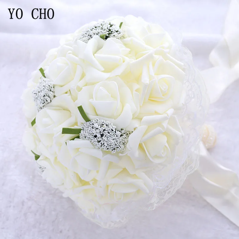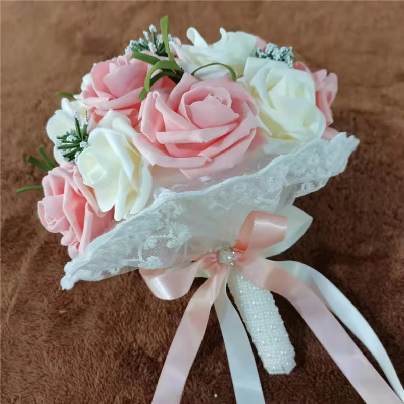 YO CHO Bridal Wedding Bouquet Bridesmaid Artificial PE Rose Flower Fake Pearl Pink Bouquet Wedding Supplies Festival Decorations