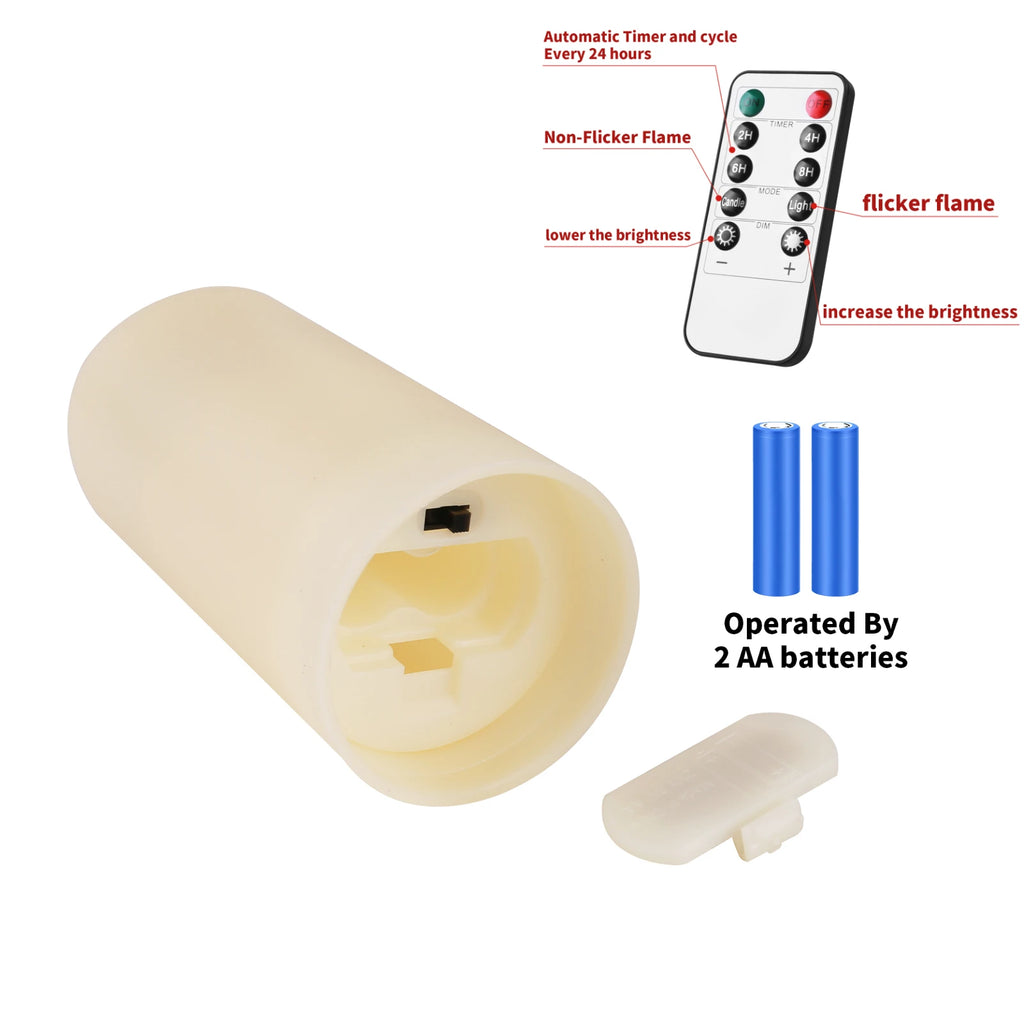 This value pack includes 3Pcs 4.1" pillars, 3Pcs 4.9"pillars, 3Pcs 5.8"pillars,3Pcs 6.8"pillars(each 2.2" diameter) candle, remote control x 2. Manual x1. This flameless candle is operated by 2 x AA batteries (Not included)