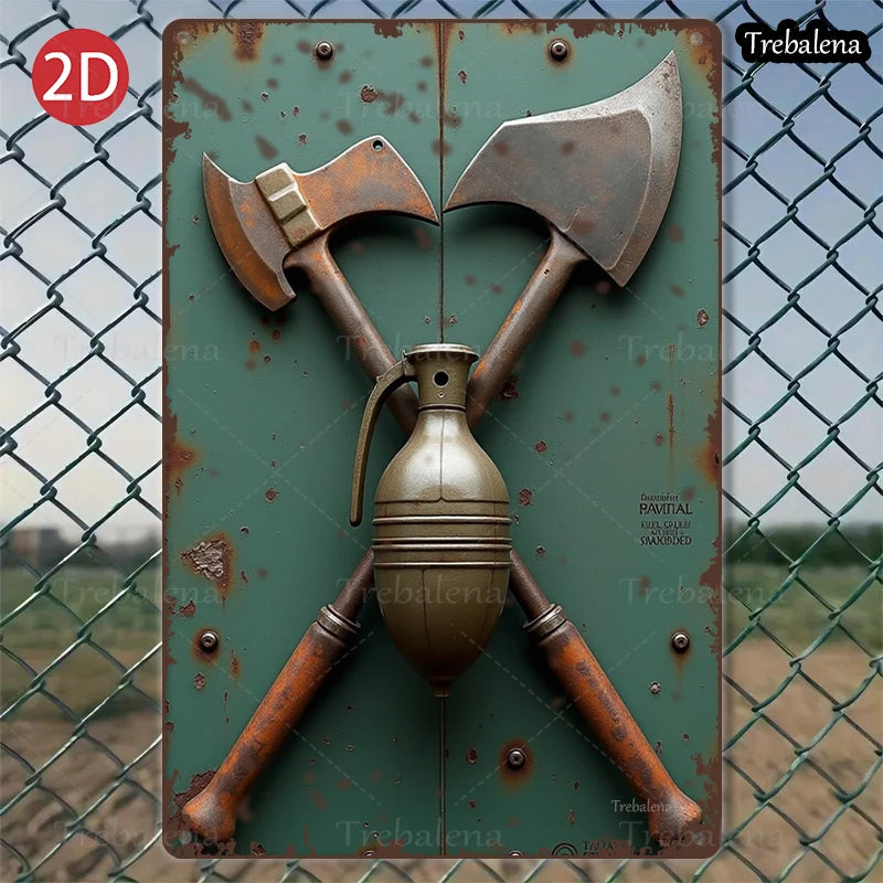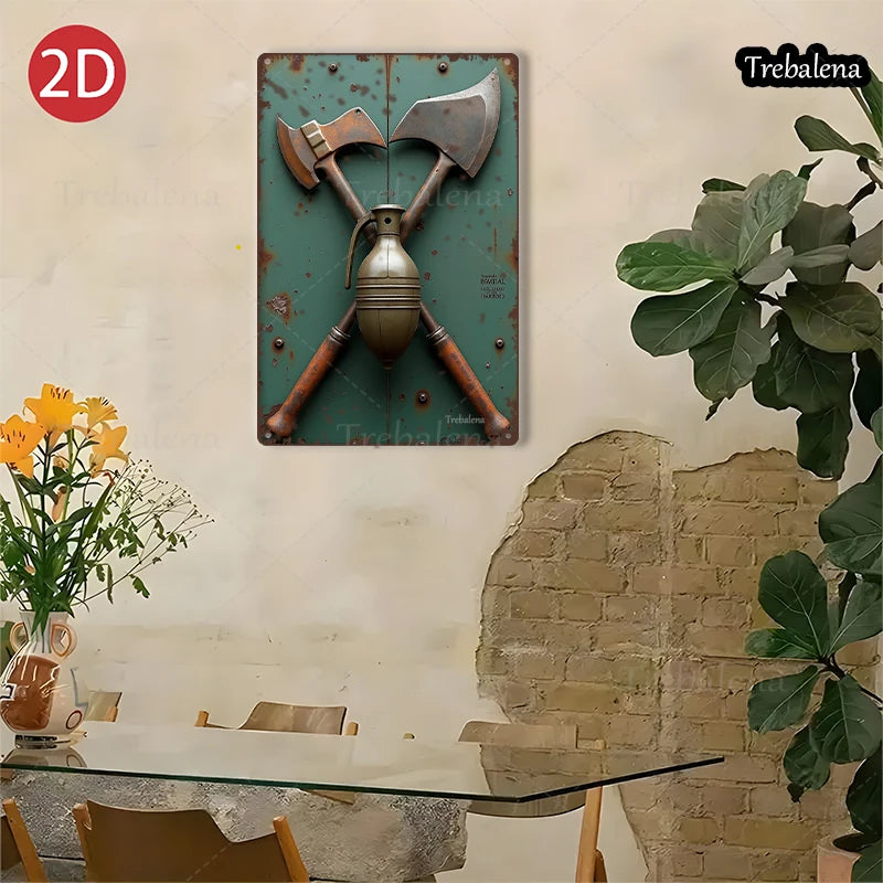 1PC 2D Flat 8*12inch Metal Sign Rustic Axes and Grenade Vintage Metal Sign Art
