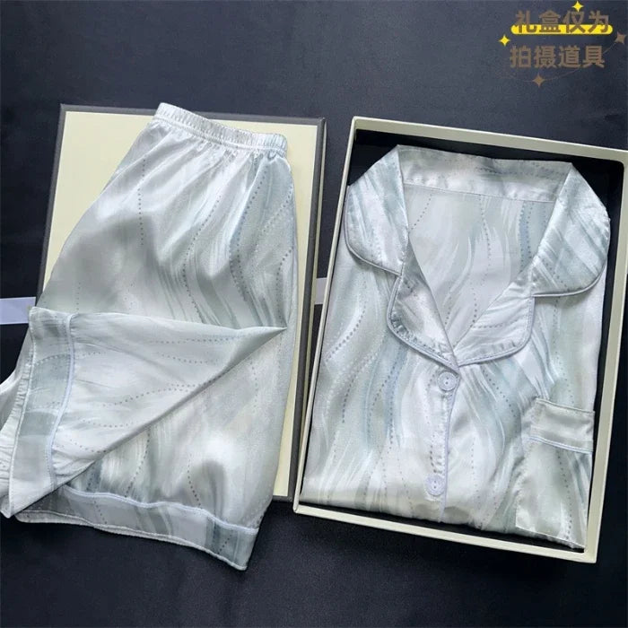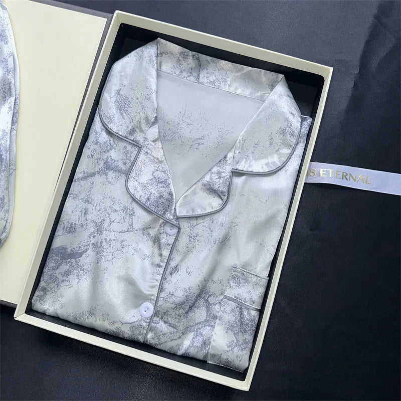 2 Pieces Print Sleepwear Faux Silk Satin Nightwear Pyjamas Fashion Casual Pajama Women Shorts Pajamas Set Ink Painting Outfits