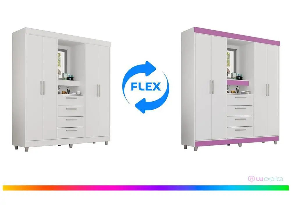 O local onde você guarda suas roupas pessoais deve ser projetado de acordo com o seu estilo de vida e também com o tamanho da sua casa. O Guarda-Roupas é uma peça fundamental no quarto, mas nem sempre é dada a importância que eles merecem. Aproveitar o espaço dedicado a essa área e armazenar e organizar roupas e acessórios é o segredo para seu bem-estar e para não ter outras áreas da casa invadidas pela má organização e bagunça. O modelo Pequim, da Araplac, possui um estilo moderno e atual, dispondo de espelho e espaço externo para acomodar itens fáceis de uso no seu dia-dia. Tem 4 portas convencionais, 4 gavetas externas com corrediças metálicas, além de 4 prateleiras e cabideiros metálicos. Ele é fabricado em MDP, revestimento em pintura UV garantindo beleza, resistência e durabilidade do móvel. Ele é um modelo Flex e na hora da montagem pode ser escolhido a variação de cor Branco e Lilás ou somente Branco. Tenha mais conforto, comodidade e encanto que seu quarto precisa! Atenção: Este guarda-roupa possui 42cm de profundidade e o tamanho médio de um cabide é de 40 a 45cm, podendo ser maior ou menor.