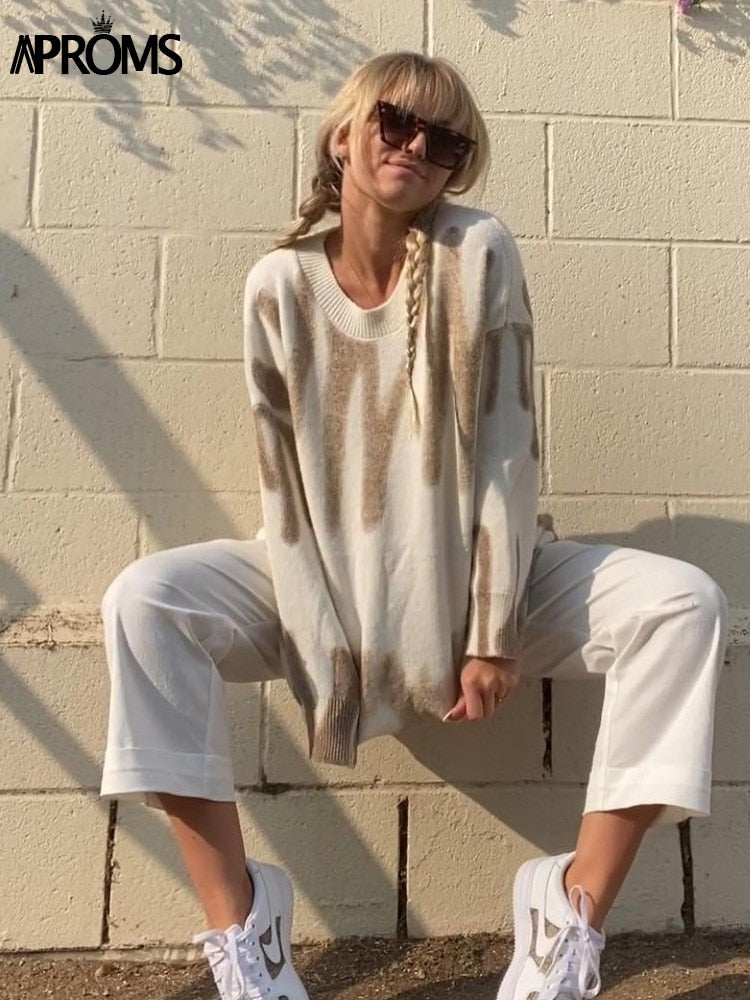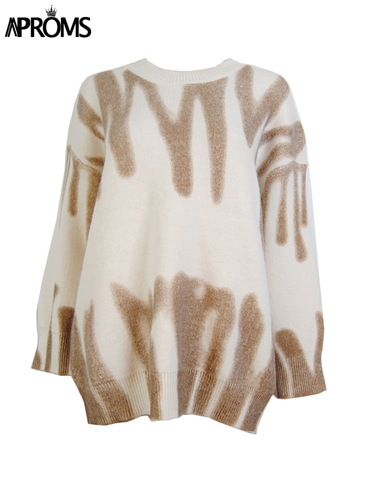 Aproms Korean Fashion Khaki Stripes Print Loose Sweaters Women Winter Hip-Pop Long Pullovers Streetwear Outerwear 2022