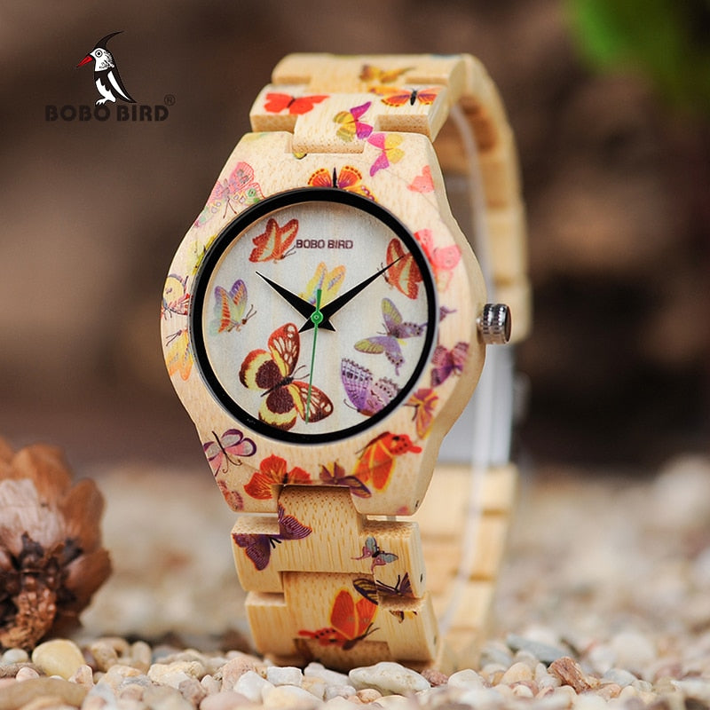 BOBO BIRD O20 Butterfly Print Women Watches All Bamboo Made Quartz Wristwatch for Ladies in Wooden Gift Box