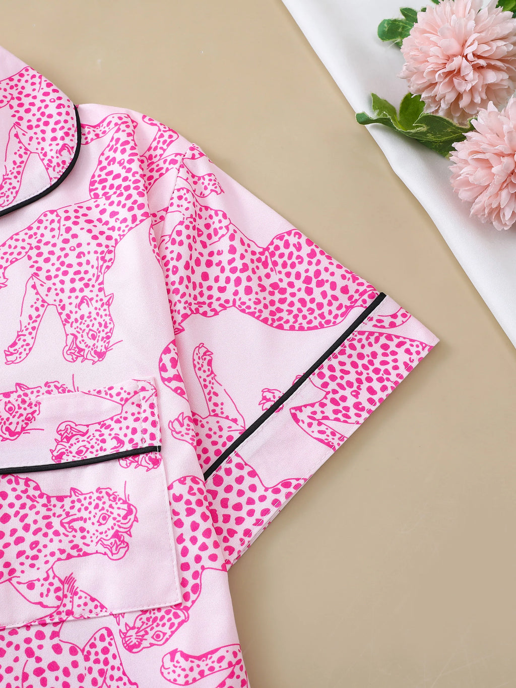 Casual pink leopard print pajama set for women lapel short-sleeved top and baggy shorts loungewear for women