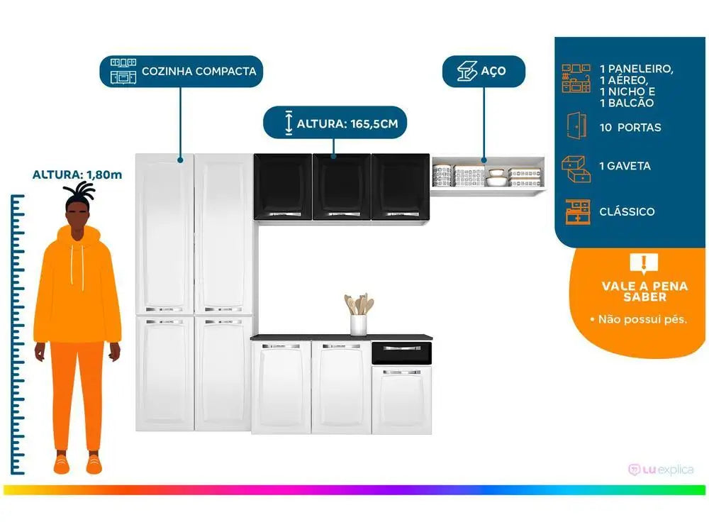 The Amanda Suspended Compact Kitchen from the Rose line of Itatiaia has a design that never goes out of fashion and with a lot of personality, Provides a cozy environment and with practical solutions for the day to day. Its structure is produced in 100% steel with coating in electrostatic powder paint of high gloss and resistant in the colors white and black, and the top in MDP coated in Formica. The furniture has 10 conventional doors with opening in metal hinges, with metallic handles, easy to handle and resistant. In addition, it has 1 drawer with telescopic slide opening and 8 shelves well distributed to fit all utensils and groceries. It also has 1 niche to decorate and organize everything with great taste. With this compact kitchen you will have a classic environment and always organized with great beauty!
