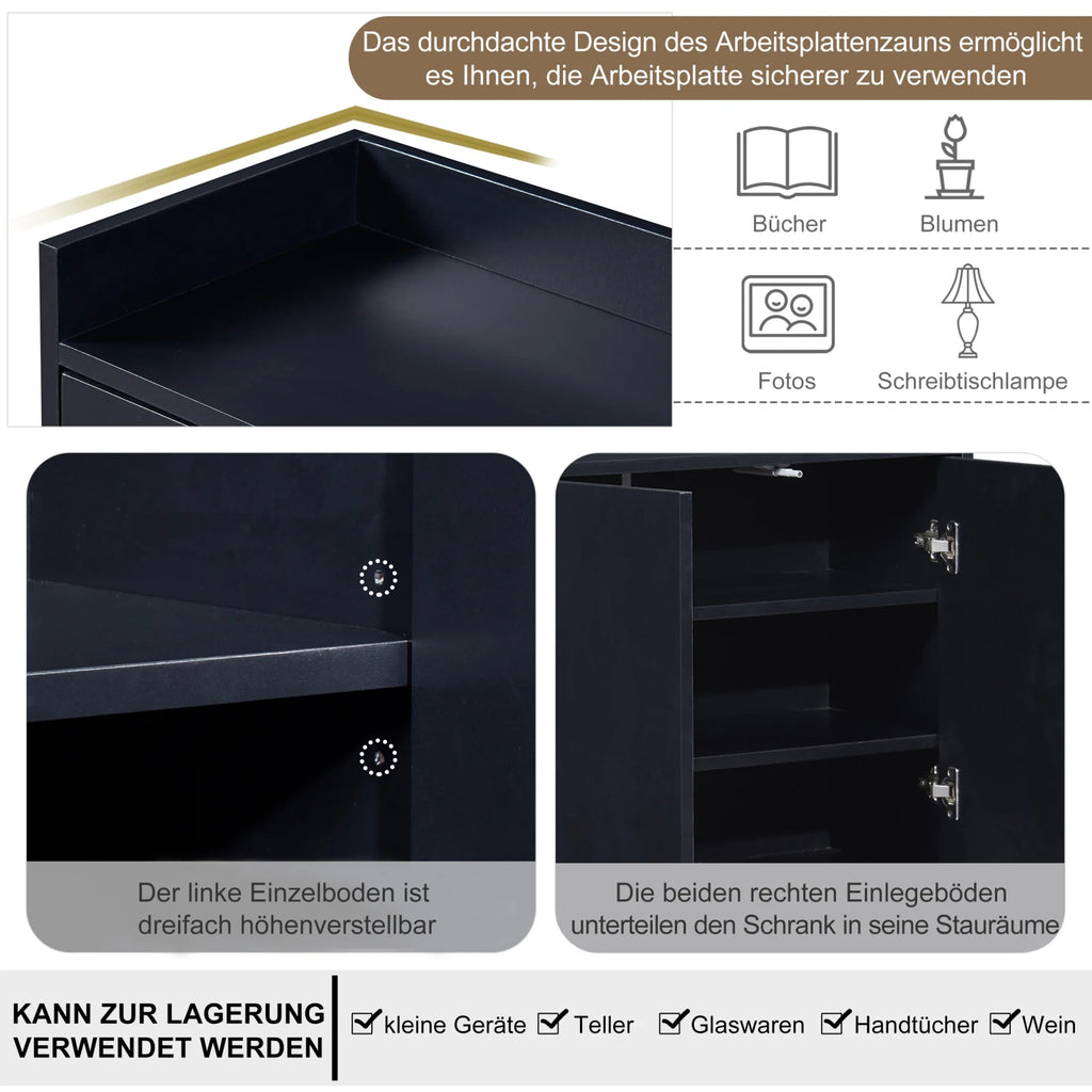 4.Four-door cabinets can fully meet your storage needs. The fence design of the desktop better protects the items you put on the desktop and prevents them from falling. You can put plates, wine glasses, various small appliances, etc. in the cabinet, and put your coffee machine on the table.