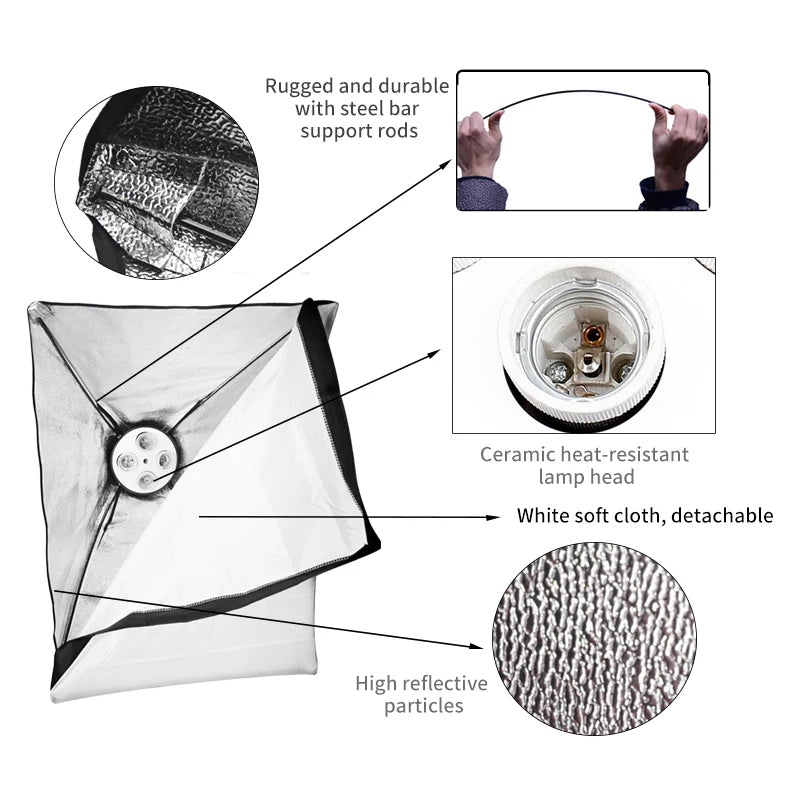 ❥ 50x70 softbox: White soft cloth,evenly soften light; Reflective silver inner, minimize light reduction; Safe and non-toxic polyester fiber,4 flexible connecting rods.