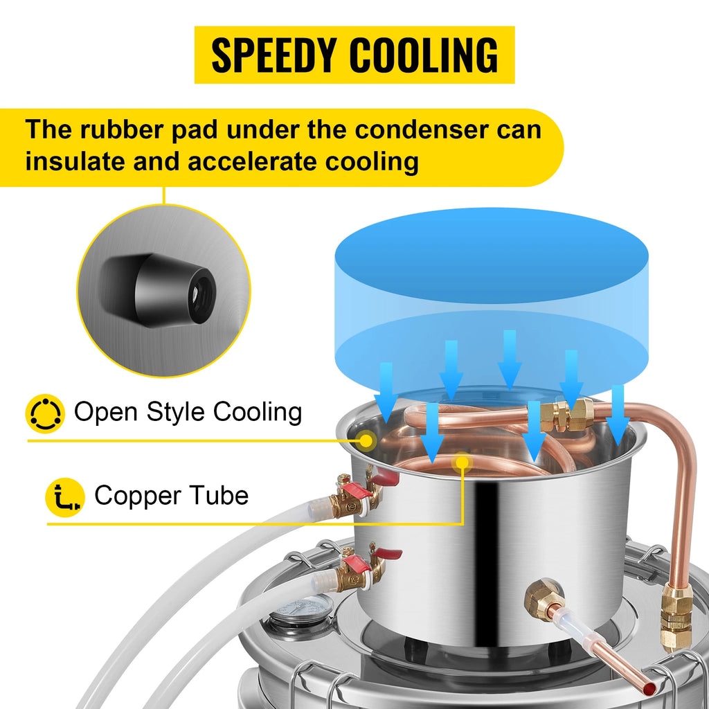Efficient and Fast Cooling: Utilizing an open cooling system, the copper coil offers excellent thermal conductivity and extensive contact with the coolant, resulting in lower distillation temperatures. The included circulating water pump conserves cooling water, while the rubber pad beneath the condenser enhances insulation and speeds up cooling.