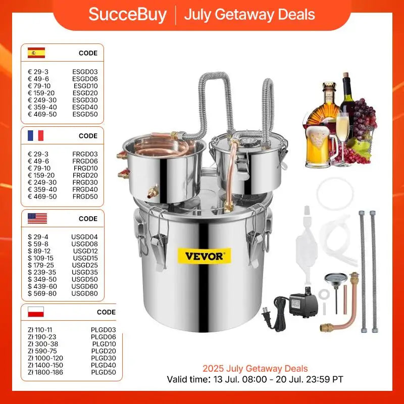 With an 8-gallon capacity, this alcohol still accommodates up to 30 liters of raw material. The boiler barrel measures 13.8" x 13.8" (35 x 35 cm), the condenser is 7.9" x 4.3" (20 x 11 cm), and the thumper is 7" x 4" (18 x 10 cm), making it perfect for enjoying distilled beverages with family and friends.