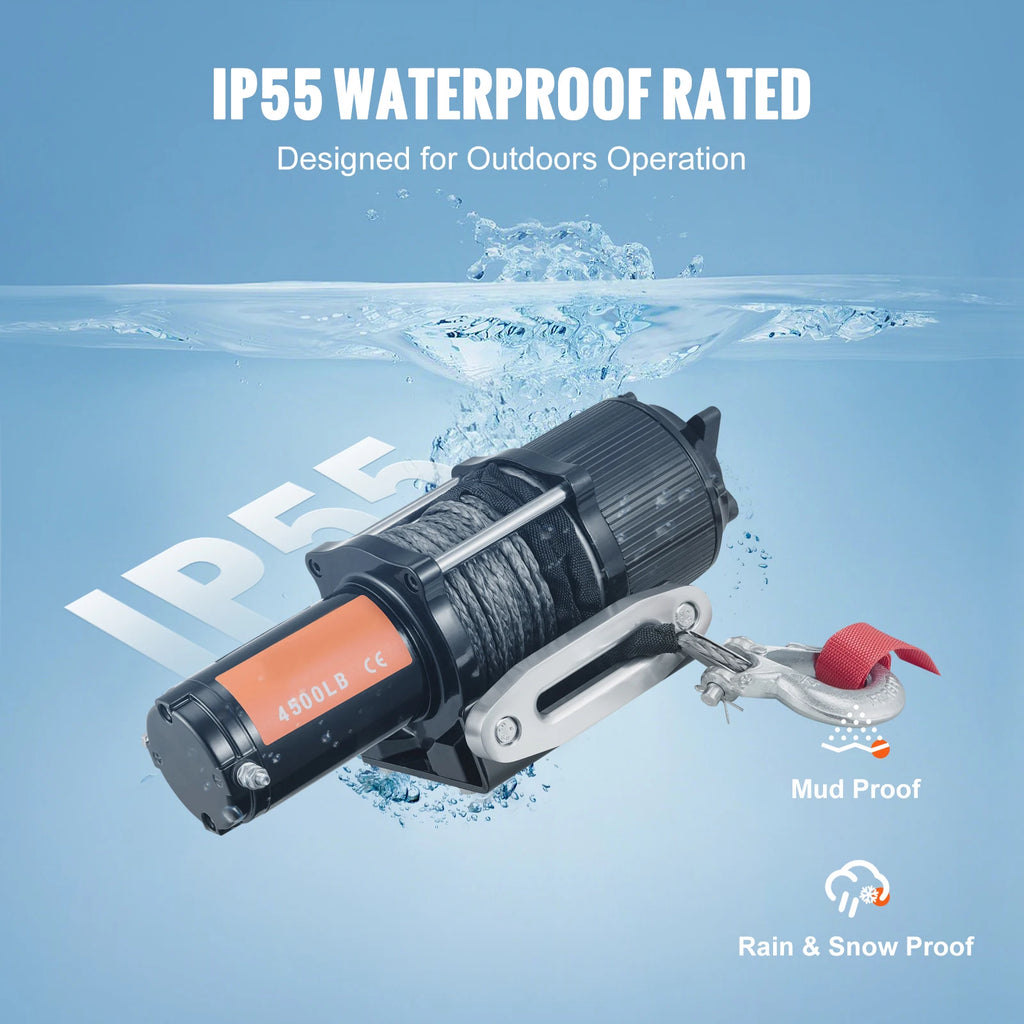 IP55 Waterproof: This winch is IP55 waterproof, easily handling the complex outdoor conditions. Thanks to this feature, it's fearless of mud, rainstorm, and snow.
