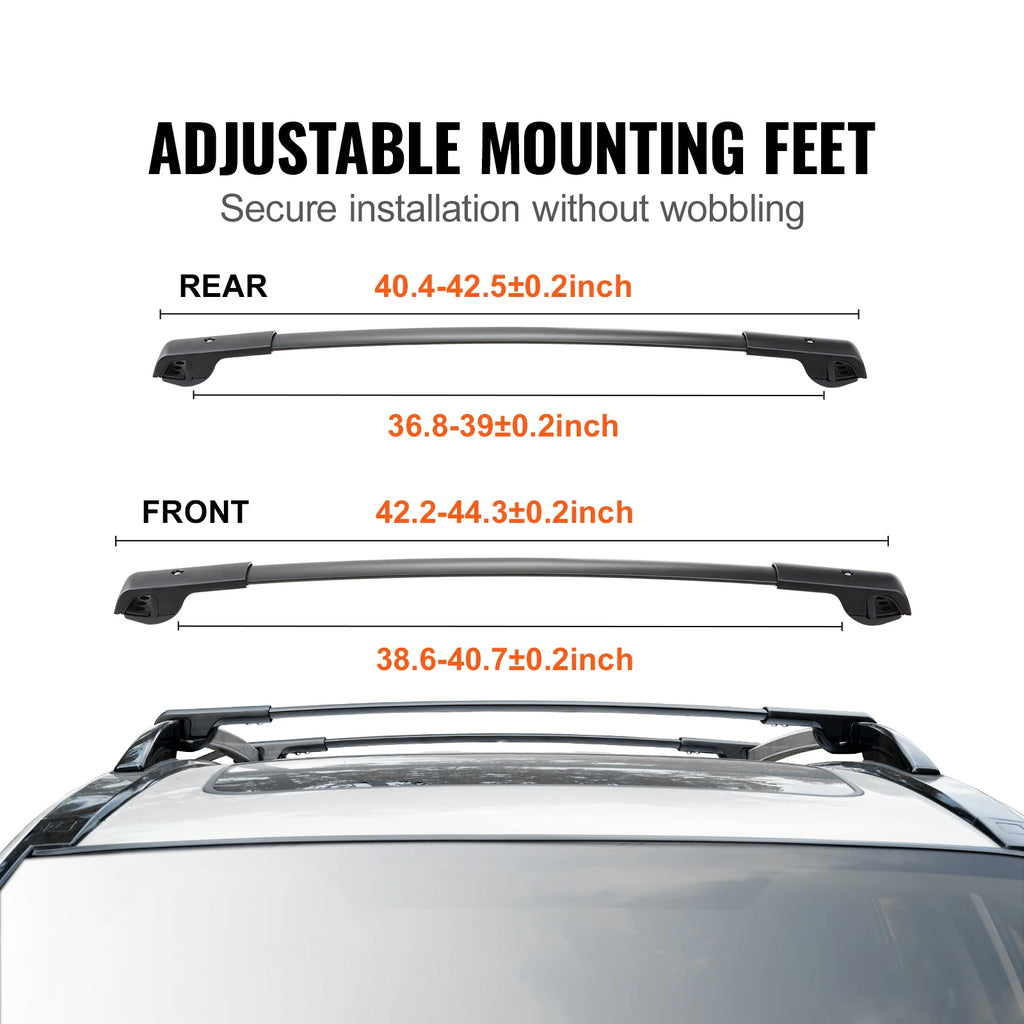 Quantity: 2 pcs, Net Weight: 7.5 lbs / 3.4 kg, Crossbars Spacing Range: 23.6-31.5 in / 600-800 mm, Front Crossbar Size: 42.2-44.3 x 3.3 x 3 in / 1070-1125 x 84 x 76 mm, Rear Crossbar Size: 40.4-42.5 x 3.3 x 3 in / 1025-1080 x 84 x 76 mm, Item Model Number: HJ-RB023B