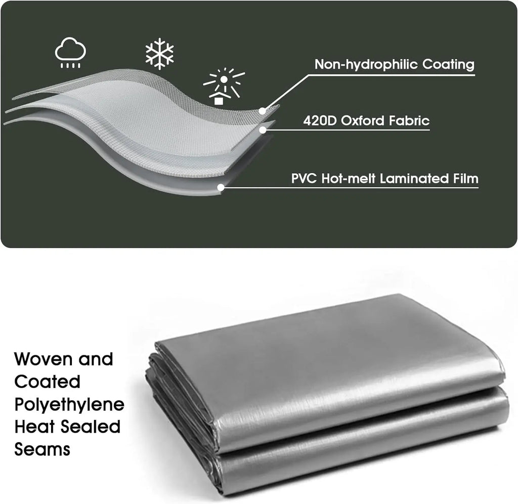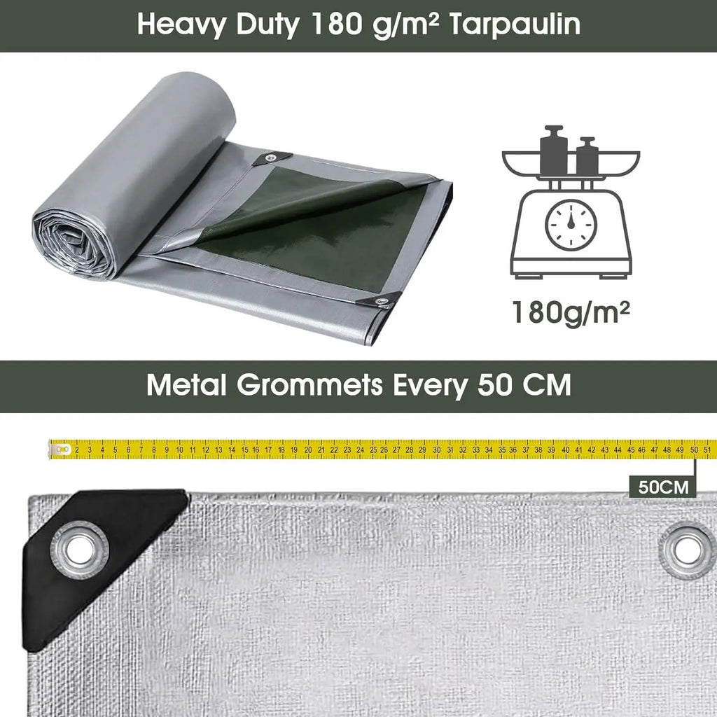 ✔️PERFECT PROTECTION The tarpaulin is 100% waterproof and UV resistant,with double-sided polyethylene coating and heat-sealed seams for long-lasting water resistance. It is a reliable choice as protection from sun,rain,snow and dirt for trucks,cars,boats,vehicles,equipment,garden furniture.