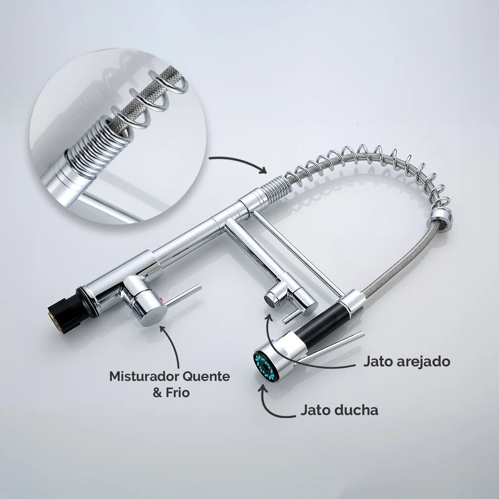 Duas opções de jato: jato arejado, para maior economia de água e jato ducha para maior pressão e facilidade na limpeza de alimentos e louças.