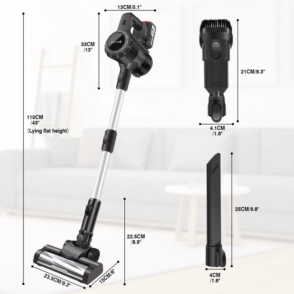This cordless stick vacuum cleaner feature with a upgraded brushless motor, delivering a strong suction of up to 45KPA, offer 2 suction modes for flexibly handle different cleaning needs, easily clean dirt, debris, dust, crumbs and pet hair. perfect for household cleaning.
