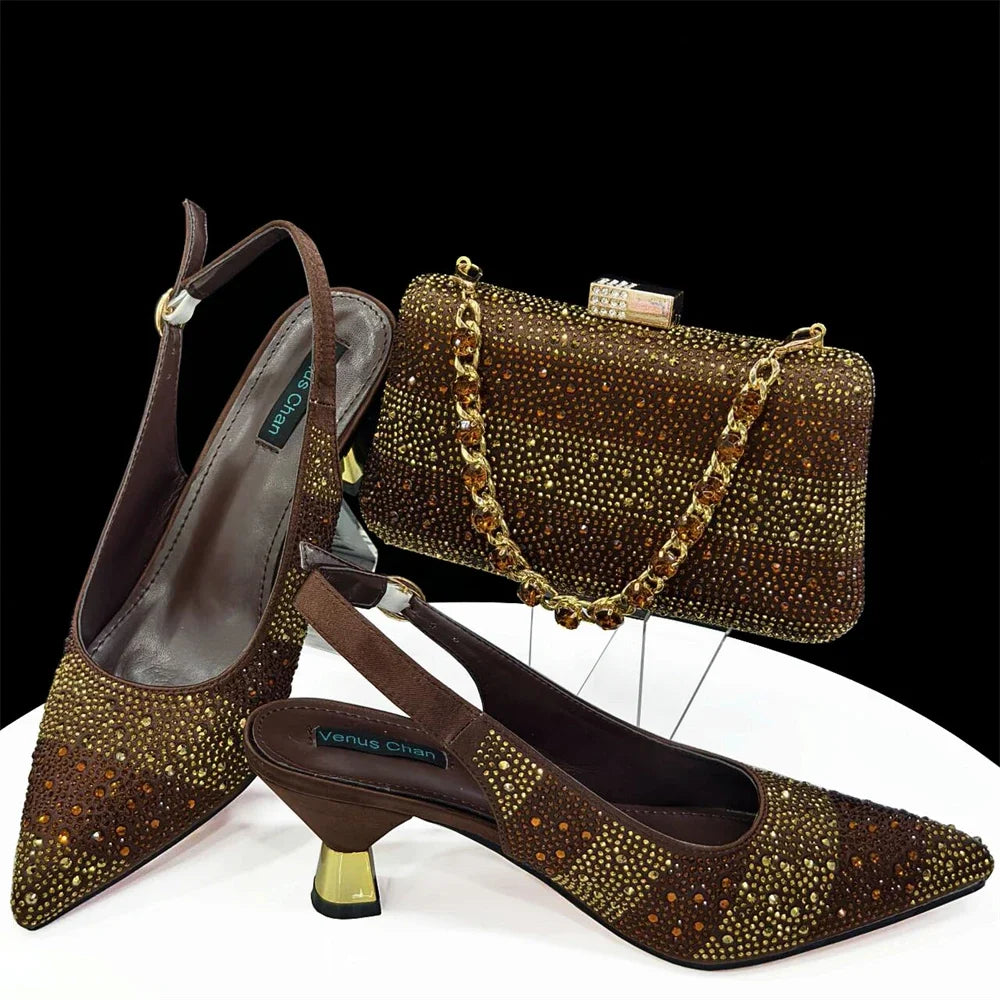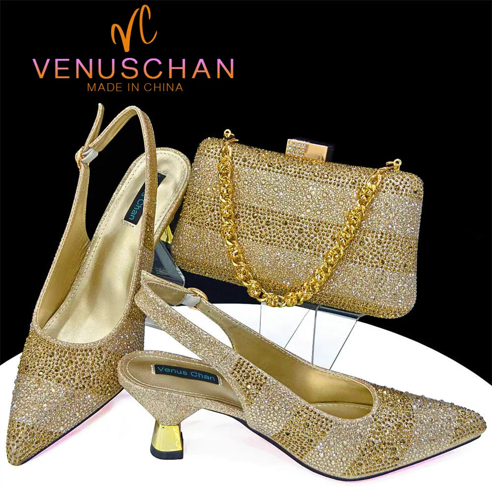 Venus Chan High Heels Shoes for Women Embroidery Rhinestone Italian Design Gold Color Pointed Toe Shoes and Bags Set Fashio