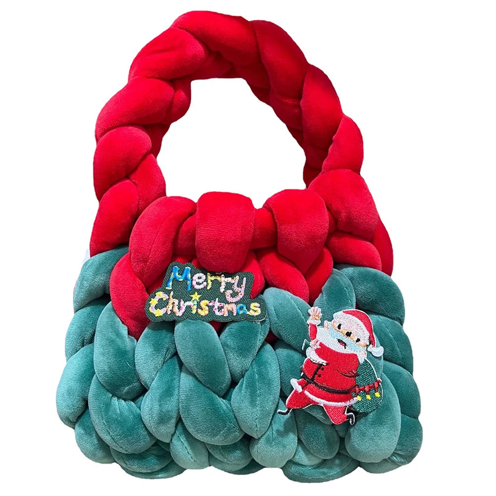 Women Hand-Woven Bag Icelandic Wool Chunky Knit Bag Hollow Out Soft Contrast Color with Short Handle Ladies Christmas Santa Bag