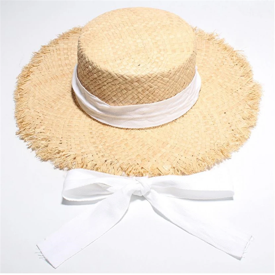 HOAREE Women Raffia Straw Sun Hat Ladies Summer Wide Brim Boater Casual Lace-Up Female Designer Brand Beach Flat Cap
