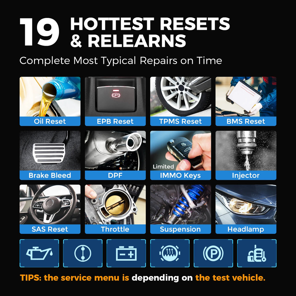 Equipped with 19 service functions, including Oil Reset, TPMS, EPB, BMS, ABS, SRS, etc that can solve various problems and meet the ever-increasing demand for faster car diagnosis.